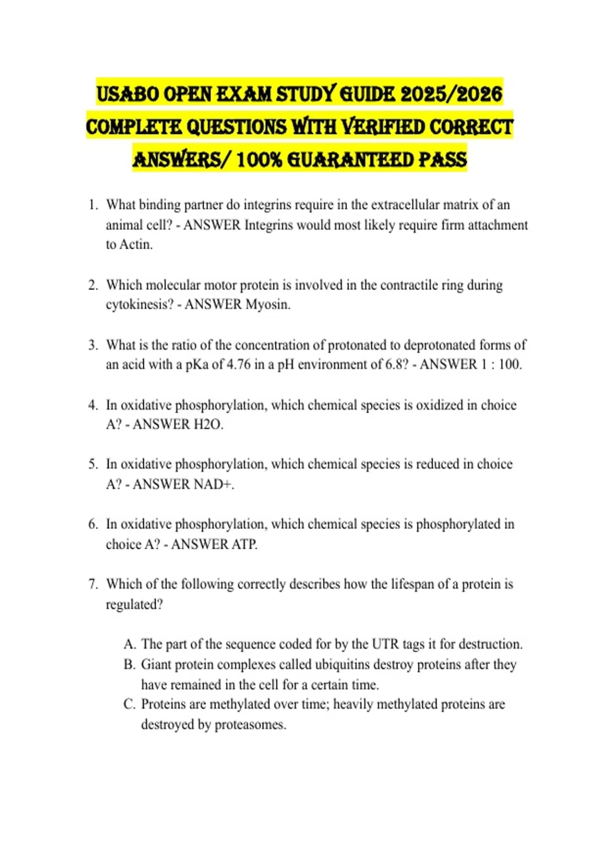 USABO Open EXAM STUDY GUIDE 2025/2026 COMPLETE QUESTIONS WITH VERIFIED CORRECT ANSWERS/ 100% GUARANTEED PASS 1. What binding partner do integrins require in the extracellular matrix of an animal cell? - ANSWER Integrins would most likely require firm attachment to Actin. 2. Which molecular motor protein is involved in the contractile ring during cytokinesis? - ANSWER Myosin. 3. What is the ratio of the concentration of protonated to deprotonated forms of an acid with a pKa of 4.76 in a pH environment of 6.8? - ANSWER 1 : 100. 4. In oxidative phosphorylation, which chemical species is oxidized in choice A? - ANSWER H2O. 5. In oxidative phosphorylation, which chemical species is reduced in choice A? - ANSWER NAD+. 6. In oxidative phosphorylation, which chemical species is phosphorylated in choice A? - ANSWER ATP. 7. Which of the following correctly describes how the lifespan of a protein is regulated? A. The part of the sequence coded for by the UTR tags it for destruction. B. Giant protein complexes called ubiquitins destroy proteins after they have remained in the cell for a certain time. C. Proteins are methylated over time; heavily methylated proteins are destroyed by proteasomes. D. Proteins are tagged with ubiquitins, which are recognized by proteasomes; the proteasomes destroy the proteins. E. Proteins tagged with methyl groups are destroyed by ubiquitins. - ANSWER D. Proteins are tagged with ubiquitins, which are recognized by proteasomes; the proteasomes destroy the proteins. 8. Of the following amino acids, which is least likely to form strong interactions with other amino acids that contribute to the tertiary structure of a given protein? A. Histidine B. Glutamate C. Cysteine D. Glycine E. Serine - ANSWER D. Glycine 1. Thymine dimers arise when two adjacent thymine bases become covalently linked. This interferes with normal DNA geometry and will cause replication errors. Which of the following agents is the primary cause of the thymine dimers? A. Chemical mutagens B. Beta emissions from radioactive decay C. Gamma rays D. X-rays E. UV rays - ANSWER E. UV rays 2. Which of the following oligonucleotides would have the highest melting point when paired with the proper complementary strand? A. 5'-AAAAAAAA-3' B. 5'-ATGCATGC-3' C. 5'-CGCGCGCG-3' D. 5'-TTTTGGGG-3' E. 5'-TATATATA-3' - ANSWER C. 5'-CGCGCGCG-3' 3. Which of the following is a way in which the cell increases gene expression in the nucleus? A. Acetylation of histone tails B. DNA methylation C. Locating a gene within heterochromatin D. Dephosphorylating DNA E. Alternative splicing - ANSWER A. Acetylation of histone tails 4. Which of the following statements about cellular ultrastructure is FALSE? A. Nonmotile eukaryotic cilia are composed of 9 doublets of microtubules in a ring, with no microtubules in the center ('9+0'). B. Bacterial flagella are composed of 9 doublets of microtubules in a ring, with two microtubules in the center ('9+2'). C. Motile eukaryotic cilia are composed of 9 doublets of microtubules in a ring, with two microtubules in the center ('9+2'). D. Centrioles are composed of nine triplets of microtubules arranged in a ring. E. The basal bodies of eukaryotic flagella are composed of nine triplets of microtubules arranged in a ring. - ANSWER B. Bacterial flagella are composed of 9 doublets of microtubules in a ring, with two microtubules in the center ('9+2'). 5. Which of the following chemicals or groups of chemicals is not a major determinant of flower color? A. Flavonols B. Carotenoids C. Cyanidin D. Phytoalexins E. Betacyanins - ANSWER D. Phytoalexins 6. Which of the following is not a characteristic of cycads? A. Secondary growth from a vascular cambium B. Fruit C. True leaves D. Insect pollination E. Presence of neurotoxins and carcinogens in plant tissues - ANSWER B. Fruit 7. . Which of the following does not take part in the light reactions of photosynthesis? A. Photosystem I B. Photosystem II C. Rubisco D. ATP synthase E. Cytochrome complex - ANSWER C. Rubisco 8. Lettuce seeds receive flashes of far red and red light in this order: far red, red, far red, red, red, red, red, far red. The seeds will A. Germinate since far red light induces germination. B. Germinate since the first flash of light determines germination. C. Germinate since there are more flashes of red light. D. Not germinate since the flashes of light have destroyed the seeds. E. Not germinate since only the last flash of light determines germination. - ANSWER E. Not germinate since only the last flash of light determines germination. 9. Which of the following statements about alternation of generations in land plants is TRUE?