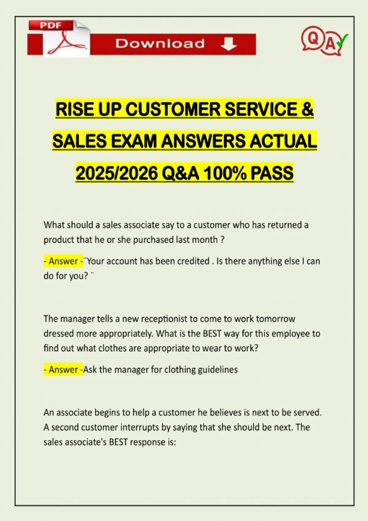 RISE UP CUSTOMER SERVICE & SALES EXAM ANSWERS ACTUAL 2025/2026 Q&A 100% PASS What should a sales associate say to a customer who has returned a product that he or she purchased last month ? - Answer -¨Your account has been credited . Is there anything else I can do for you? ¨ The manager tells a new receptionist to come to work tomorrow dressed more appropriately. What is the BEST way for this employee to find out what clothes are appropriate to wear to work? - Answer -Ask the manager for clothing guidelines An associate begins to help a customer he believes is next to be served. A second customer interrupts by saying that she should be next. The sales associate's BEST response is:Need assistance on Online classes, Exams & Assignments? Reach out for instant help!! Full Course Assistance, Plagiarism-free Essay Writing, Research Paper, Dissertation, Discussion Posts, etc…. Confidential & Secure services. Tutors are available for all subjects! Email now at: - Answer -Try to find another sales associate to help one of the customers. An associate in an electronics store is helping a customer with a grandchild buy an answering machine. The customer would like a demonstration of a particular machin