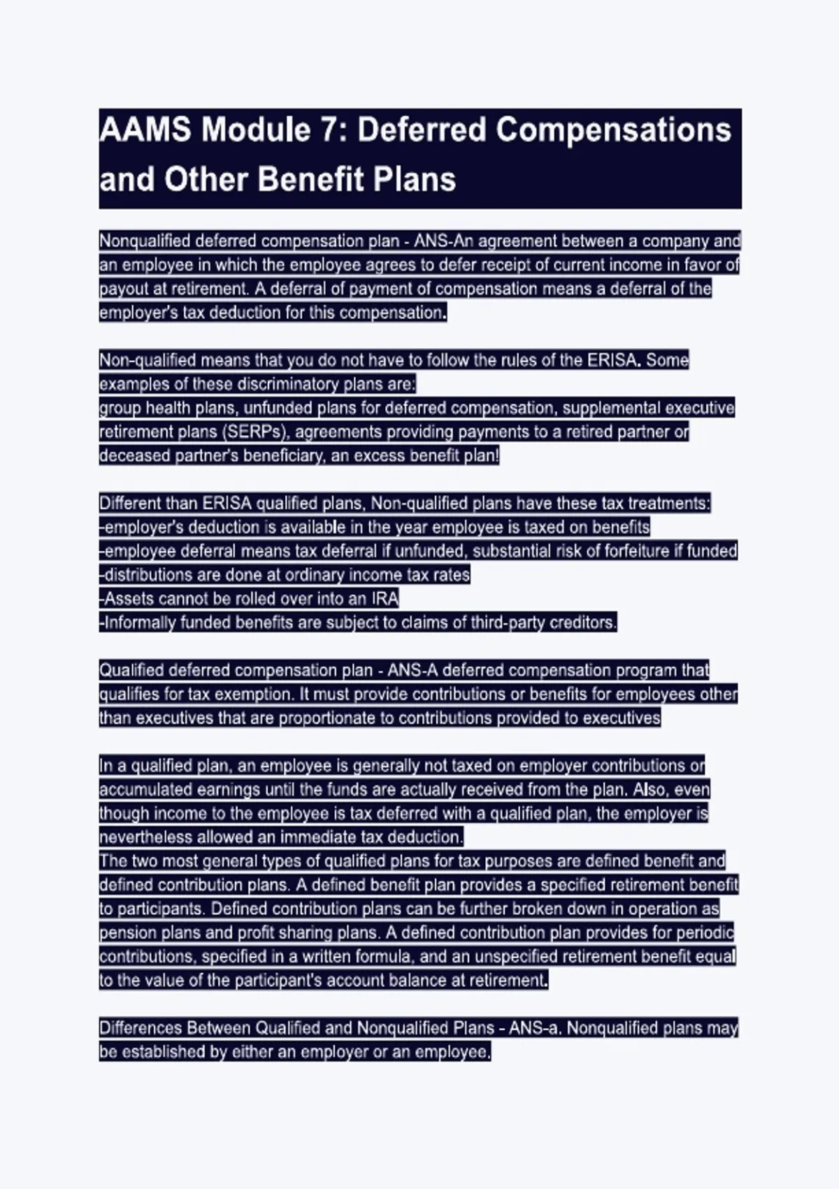 AAMS Module 7 Deferred Compensations and Other Benefit Plans questions and answers