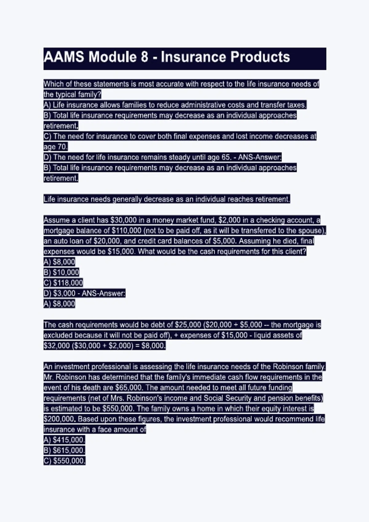 AAMS Module 8 - Insurance Products questions and answers
