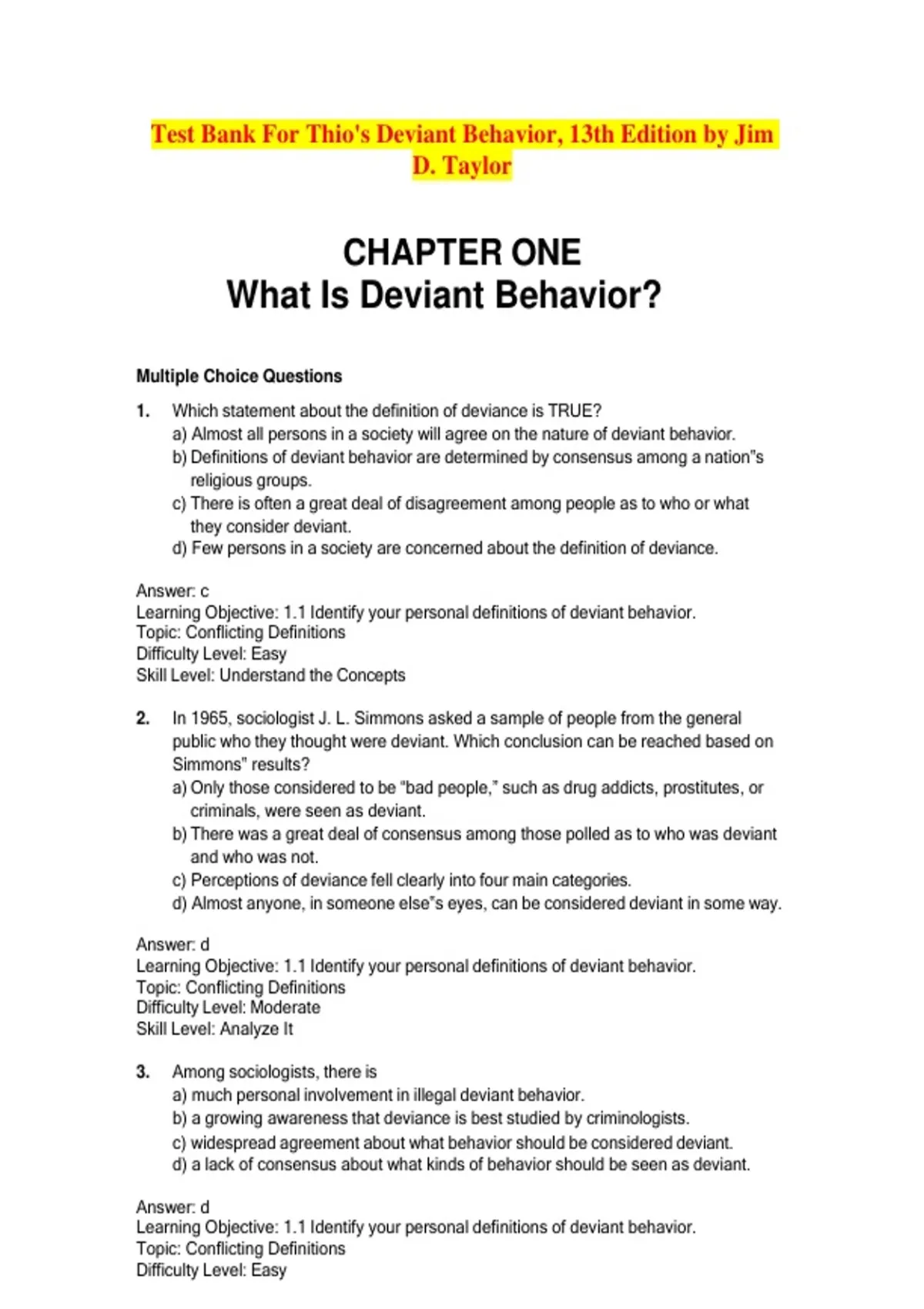 Test Bank For Thio's Deviant Behavior, 13th Edition by Jim
