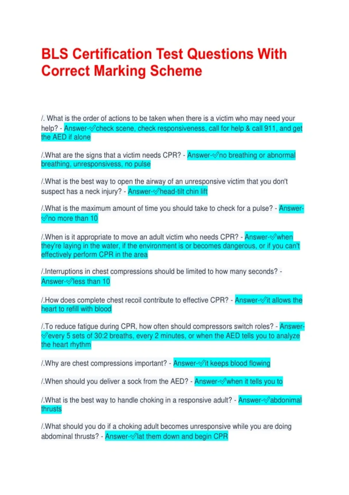 BLS Certification Test Questions With Correct Marking Scheme /. What is the order of actions to be taken when there is a victim who may need your help? - Answer-check scene, check responsiveness, call for help & call 911, and get the AED if alone /.What are the signs that a victim needs CPR? - Answer-no breathing or abnormal breathing, unresponsivess, no pulse /.What is the best way to open the airway of an unresponsive victim that you don't suspect has a neck injury? - Answer-head-tilt chin lift /.What is the maximum amount of time you should take to check for a pulse? - Answer-no more than 10 /.When is it appropriate to move an adult victim who needs CPR? - Answer-when they're laying in the water, if the environment is or becomes dangerous, or if you can't effectively perform CPR in the area /.Interruptions in chest compressions should be limited to how many seconds? - Answer-less than 10 /.How does complete chest recoil contribute to effective CPR? - Answer-it allows the heart to refill with blood /.To reduce fatigue during CPR, how often should compressors switch roles? - Answer-every 5 sets of 30:2 breaths, every 2 minutes, or when the AED tells you to analyze the heart rhythm /.Why are chest compressions important? - Answer-it keeps blood flowing /.When should you deliver a sock from the AED? - Answer-when it tells you to /.What is the best way to handle choking in a responsive adult? - Answer-abdonimal thrusts /.What should you do if a choking adult becomes unresponsive while you are doing abdominal thrusts? - Answer-lat them down and begin CPR