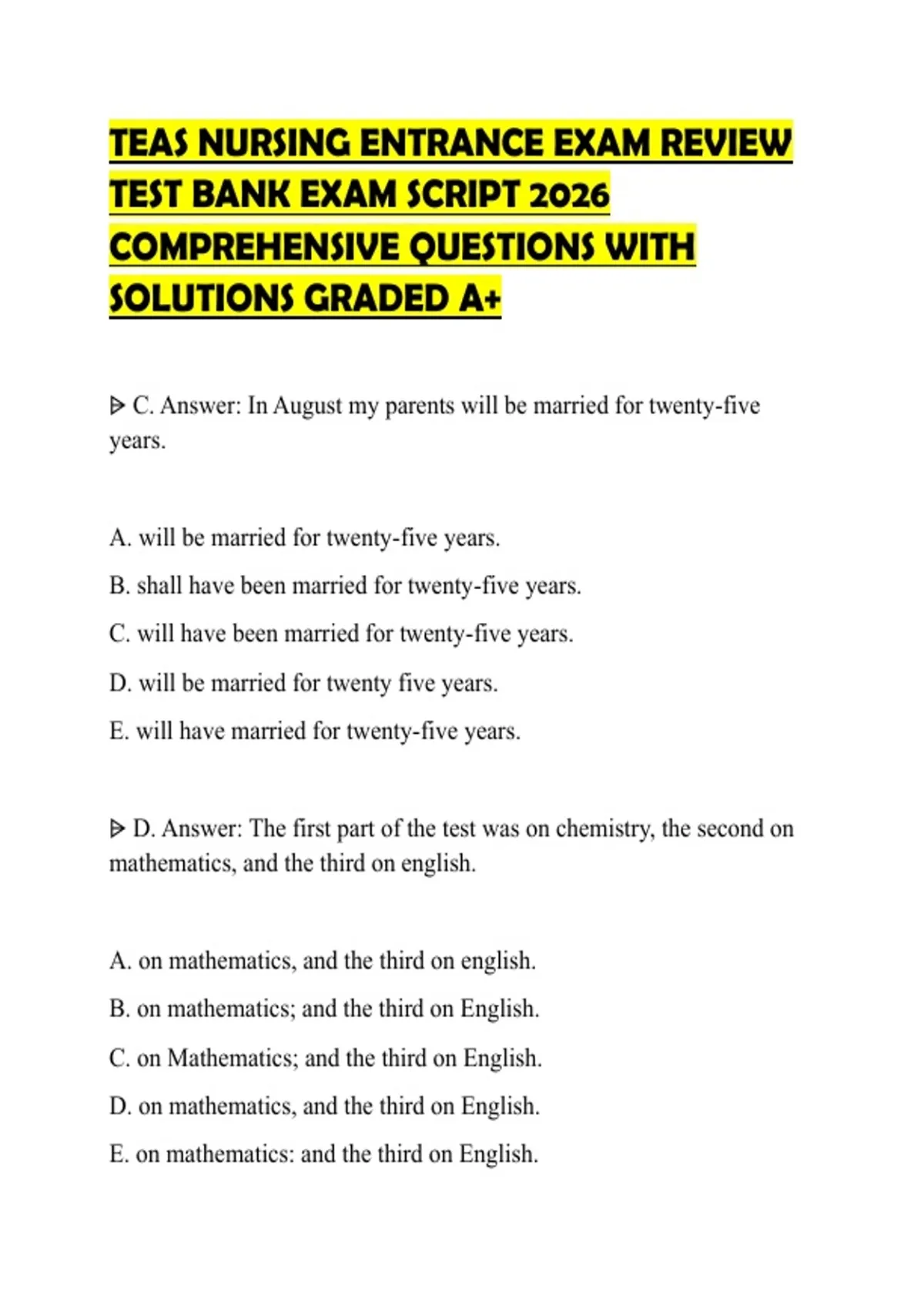 TEAS NURSING ENTRANCE EXAM REVIEW TEST BANK EXAM SCRIPT 2026 COMPREHENSIVE QUESTIONS WITH SOLUTIONS GRADED A+