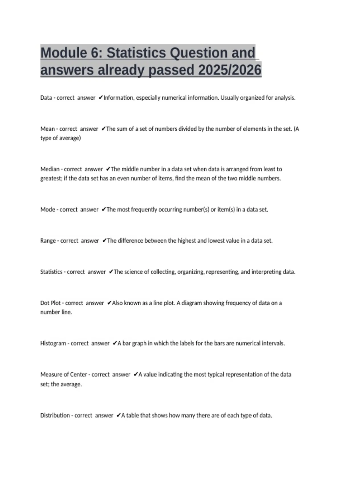 Statistics - correct answer ✔The science of collecting, organizing, representing, and interpreting data.
