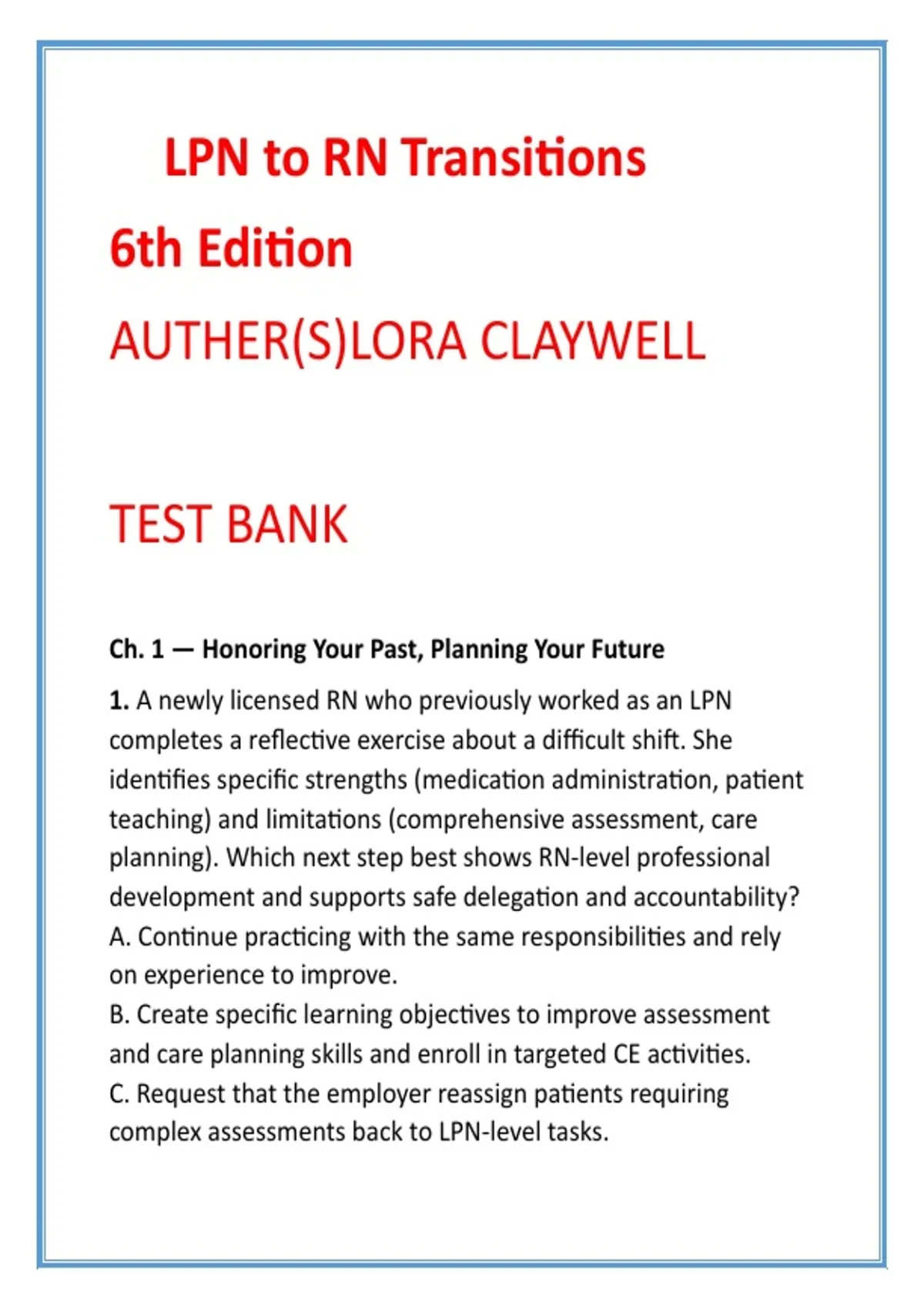 LPN to RN Transitions Test Bank | Claywell 6th Edition | LPN-RN Bridge NCLEX-Style MCQs & Rationales 2) SEO Product Description (200–300 words) Advance confidently from Licensed Practical Nurse to Registered Nurse with this comprehensive LPN to RN Transitions Test Bank, fully aligned with Lora Claywell’s LPN to RN Transitions, 6th Edition. This digital resource is purpose-built for LPN-to-RN bridge students who must master expanded scope, professional accountability, and RN-level clinical judgment. Covering ALL units and chapters of the textbook, this test bank includes 20 high-quality NCLEX-style multiple-choice questions per chapter, each written at the application-to-analysis level. Questions are grounded in realistic role-transition scenarios that reflect the daily challenges faced by nurses moving into the RN role—delegation decisions, prioritization of care, leadership responsibilities, legal accountability, and patient safety. Every question includes a clearly identified correct answer and a detailed, evidence-based rationale that explains not only what is correct, but why it reflects RN-level thinking. Rationales also clarify common LPN-level misconceptions, making this an ideal learning tool—not just an exam resource. This test bank is ideal for students enrolled in LPN-to-RN Bridge Programs, Practical-to-Professional Nursing Transition courses, RN Role Development courses, and for learners preparing for NCLEX-RN®–style clinical judgment questions. Key Features Full-chapter coverage of LPN to RN Transitions (6th Edition) 20 NCLEX-style MCQs per chapter Detailed rationales emphasizing RN scope and accountability Focus on delegation, prioritization, leadership, and legal practice Time-saving, exam-focused, and confidence-building digital format Built on Lora Claywell’s widely adopted transition textbook, this test bank supports safe, competent, and professional RN role development. 3) High-Value SEO Keywords (8) LPN to RN transitions test bank Claywell LPN to RN study guide LPN to RN bridge program questions RN role transition MCQs NCLEX style LPN to RN questions nursing transition course test bank RN scope of practice exam questions professional nursing role development MCQs 4) Hashtags (10) #LPNtoRN #NursingBridgeProgram #RNRoleTransition #ClaywellTransitions #NCLEXStyleQuestions #NursingTestBank #ProfessionalNursingPractice #RNClinicalJudgment #DelegationAndPrioritization #NursingEducationResources