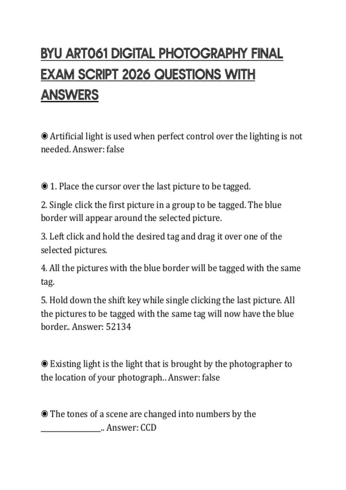 BYU ART061 DIGITAL PHOTOGRAPHY FINAL EXAM SCRIPT 2026 QUESTIONS WITH ANSWERS