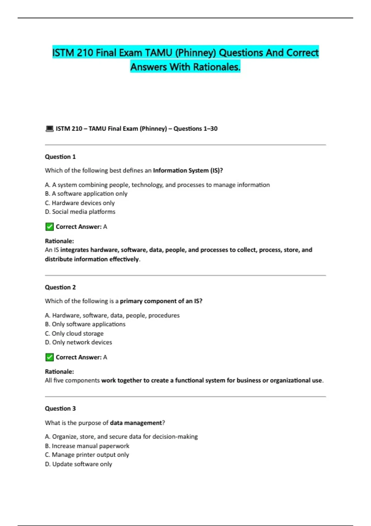 ISTM 210 Final Exam TAMU (Phinney) Questions And Correct Answers With Rationales.