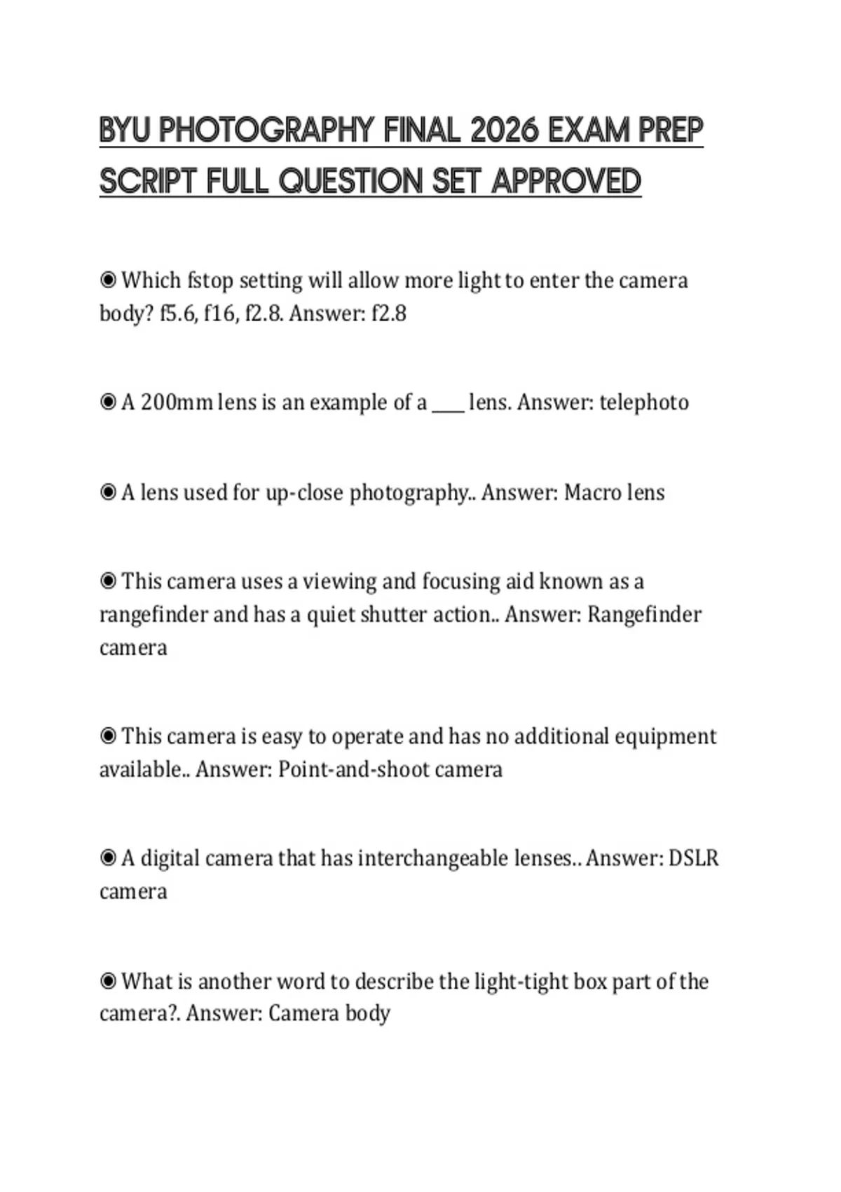 BYU PHOTOGRAPHY FINAL 2026 EXAM PREP SCRIPT FULL QUESTION SET APPROVED