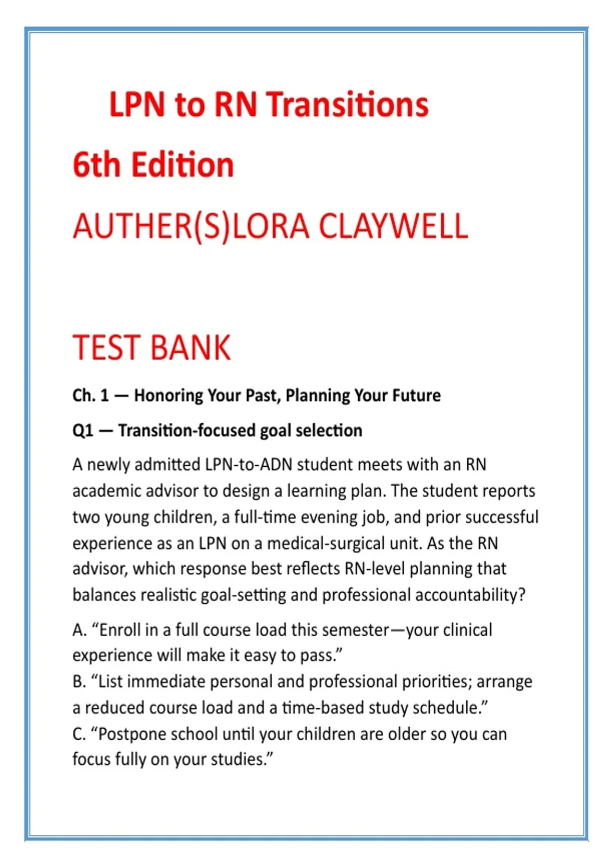 LPN to RN Transitions Test Bank | Claywell 6th Edition | LPN-RN Bridge NCLEX-Style MCQs & RN Role Development 2) SEO Product Description (200–300 words) Successfully transitioning from Licensed Practical Nurse to Registered Nurse requires more than content review—it demands RN-level clinical judgment, delegation mastery, and professional accountability. This comprehensive LPN to RN Transitions Test Bank is expertly aligned with Lora Claywell’s LPN to RN Transitions, 6th Edition and is purpose-built for students enrolled in LPN-to-RN Bridge Programs and RN Role Transition courses. This digital test bank provides full textbook coverage of every unit and chapter, with 20 high-quality NCLEX-style multiple-choice questions per chapter. Each item is written at the application and analysis level, reflecting real-world challenges faced by transitioning nurses. Detailed, evidence-based rationales reinforce correct decision-making while correcting common LPN-to-RN role misconceptions. Designed to strengthen scope-of-practice expansion, delegation and supervision, prioritization, leadership readiness, legal accountability, and patient safety, this resource mirrors the expectations of RN education and NCLEX-RN® clinical judgment standards. Whether you are preparing for unit exams, comprehensive finals, or reinforcing professional nursing identity, this test bank saves time, builds confidence, and sharpens RN-level thinking. Ideal for: LPN-to-RN Bridge Programs, Practical-to-Professional Nursing Transition Courses, RN Role Development coursework, and NCLEX-RN preparation modules. Key Features Full coverage of LPN to RN Transitions (6th Edition) by Lora Claywell 20 NCLEX-style MCQs per chapter Detailed rationales focused on RN scope and accountability Delegation, prioritization, leadership, and legal decision-making scenarios Exam-ready, clinically accurate, and professionally aligned Advance from task-focused practice to confident RN clinical judgment with this high-impact transition test bank. 3) 8 High-Value SEO Keywords LPN to RN transitions test bank Claywell LPN to RN 6th edition LPN RN bridge program study guide nursing role transition MCQs RN delegation and prioritization questions NCLEX style LPN to RN questions professional nursing practice test bank LPN to RN scope of practice exam prep 4) 10 Hashtags #LPNtoRN #NursingBridgeProgram #RNRoleTransition #NursingTestBank #NCLEXStyleQuestions #ProfessionalNursingPractice #NursingEducationResources #RNClinicalJudgment #DelegationAndPrioritization #NursingStudents