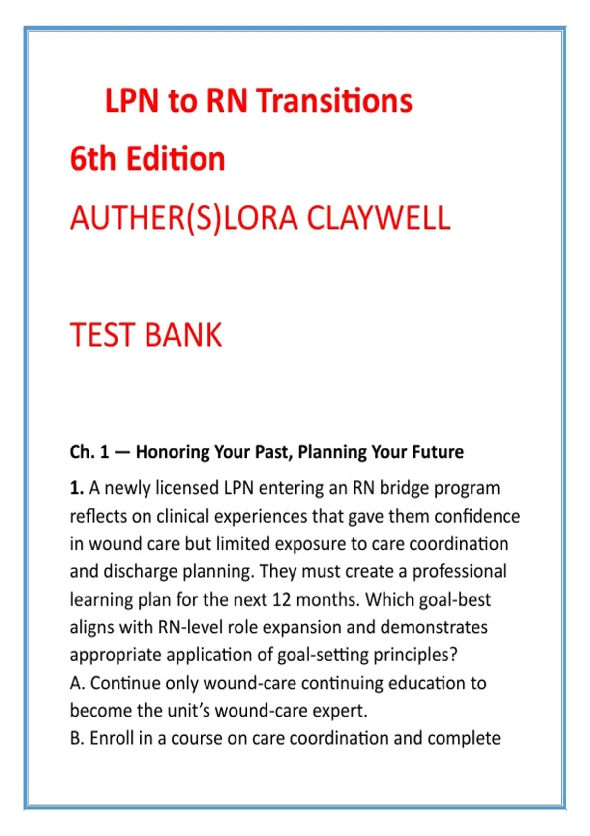 LPN to RN Transitions Test Bank (6th Ed) – Claywell | LPN-RN Bridge NCLEX-Style MCQs & RN Role Development 2) SEO Product Description (200–300 words) Master the transition from Licensed Practical Nurse to Registered Nurse with this comprehensive LPN to RN Transitions Test Bank based on Lora Claywell’s LPN to RN Transitions, 6th Edition—one of the most trusted textbooks for professional nursing role advancement. This digital test bank provides full textbook coverage of ALL units and chapters, with 20 high-quality NCLEX-style multiple-choice questions (MCQs) per chapter, written specifically to assess RN-level clinical judgment, delegation, prioritization, and professional accountability. Each question is paired with clear, evidence-based rationales that reinforce safe practice, scope-of-practice expansion, and leadership decision-making expected of the Registered Nurse. Designed for LPN-to-RN Bridge Programs and RN Role Transition courses, this resource saves time, builds confidence, and strengthens exam readiness by targeting the exact challenges faced during the practical-to-professional nursing transition. Scenarios emphasize realistic role-transition situations, including supervision of unlicensed assistive personnel, legal and ethical accountability, interprofessional communication, and patient safety across adult health settings. Whether you are preparing for course exams, competency assessments, or NCLEX-RN–style clinical judgment, this test bank supports deep understanding—not memorization—so you can step confidently into the RN role. What’s Included: FULL coverage of LPN to RN Transitions, 6th Edition (all units & chapters) 20 NCLEX-style MCQs per chapter Correct answers with detailed, exam-ready rationales Focus on delegation, prioritization, leadership, and RN scope of practice Ideal for bridge programs, transition courses, and NCLEX-RN preparation A must-have study tool for nurses advancing from LPN to RN with confidence and competence. 3) 8 High-Value SEO Keywords LPN to RN transitions test bank Claywell LPN to RN test bank LPN to RN bridge program MCQs LPN to RN transitions 6th edition RN role transition nursing questions LPN to RN NCLEX style questions Practical to registered nurse test bank Nursing transition course study guide 4) 10 Hashtags #LPNtoRN #LPNtoRNBridge #NursingTransition #RNRoleDevelopment #NursingTestBank #NCLEXStyleQuestions #NursingEducation #BridgeProgramNursing #ProfessionalNursingPractice #RNClinicalJudgment