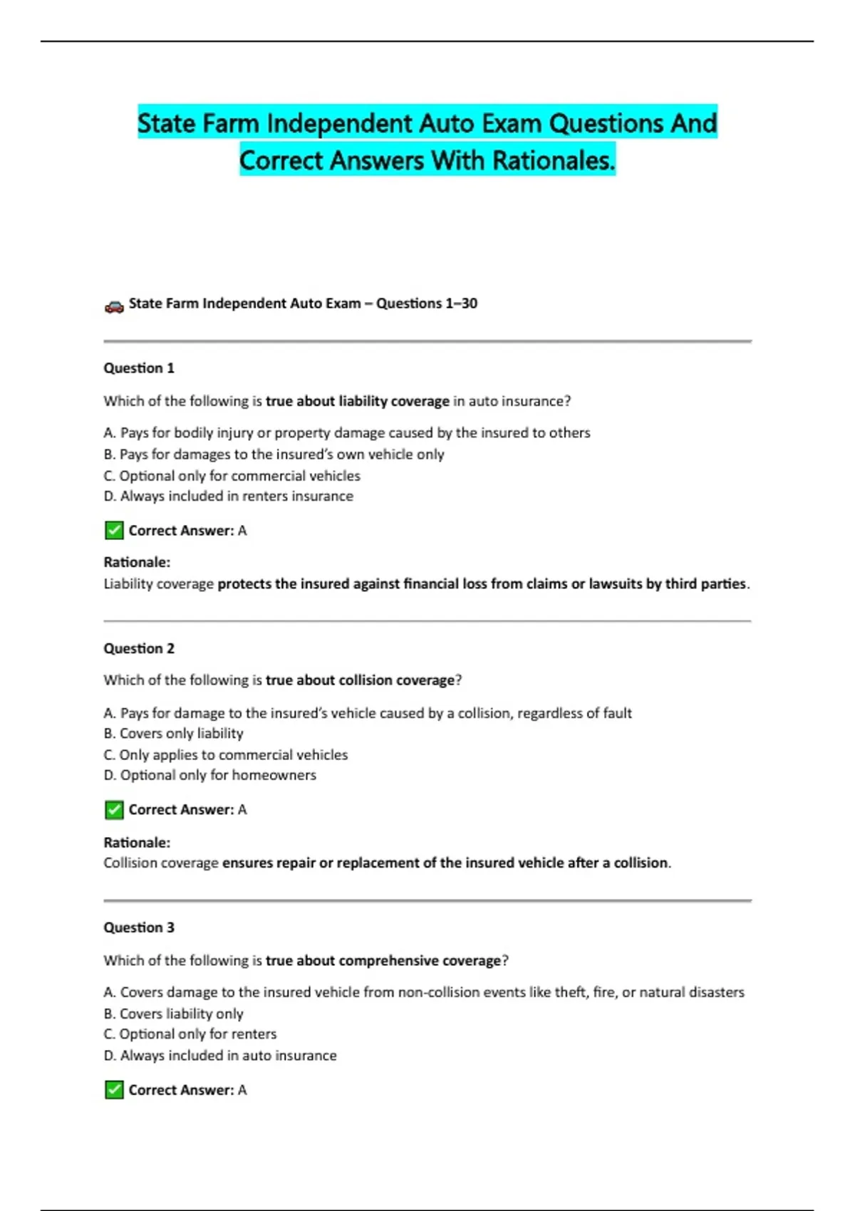 State Farm Independent Auto Exam – Questions 1–30