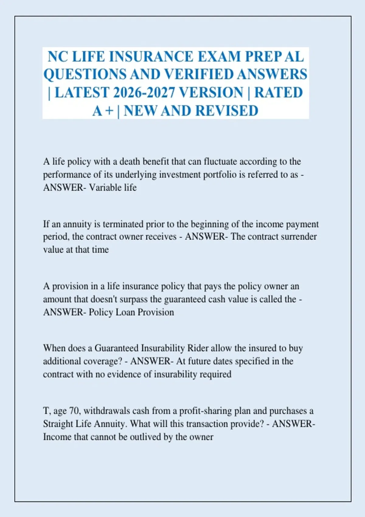 NC LIFE INSURANCE EXAM PREP AL QUESTIONS AND VERIFIED ANSWERS | LATEST VERSION | RATED A + | NEW AND REVISED