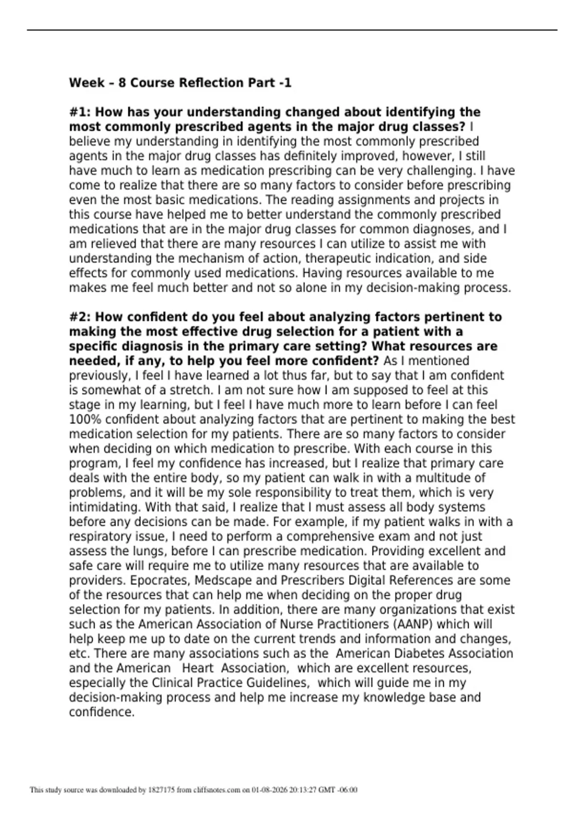 This document provides a complete course reflection for NR565 Week 8 (Part 1), featuring structured reflection content and sample answers fully aligned with NR565 course outcomes, advanced practice nursing competencies, and reflection assignment guidelines. Updated for 2026/2027, it addresses key learning experiences, prescribing practices, policy application, professional growth, and clinical decision-making reflections. Ideal for assignment guidance, course completion support, reflection writing, and advanced nursing practice success.