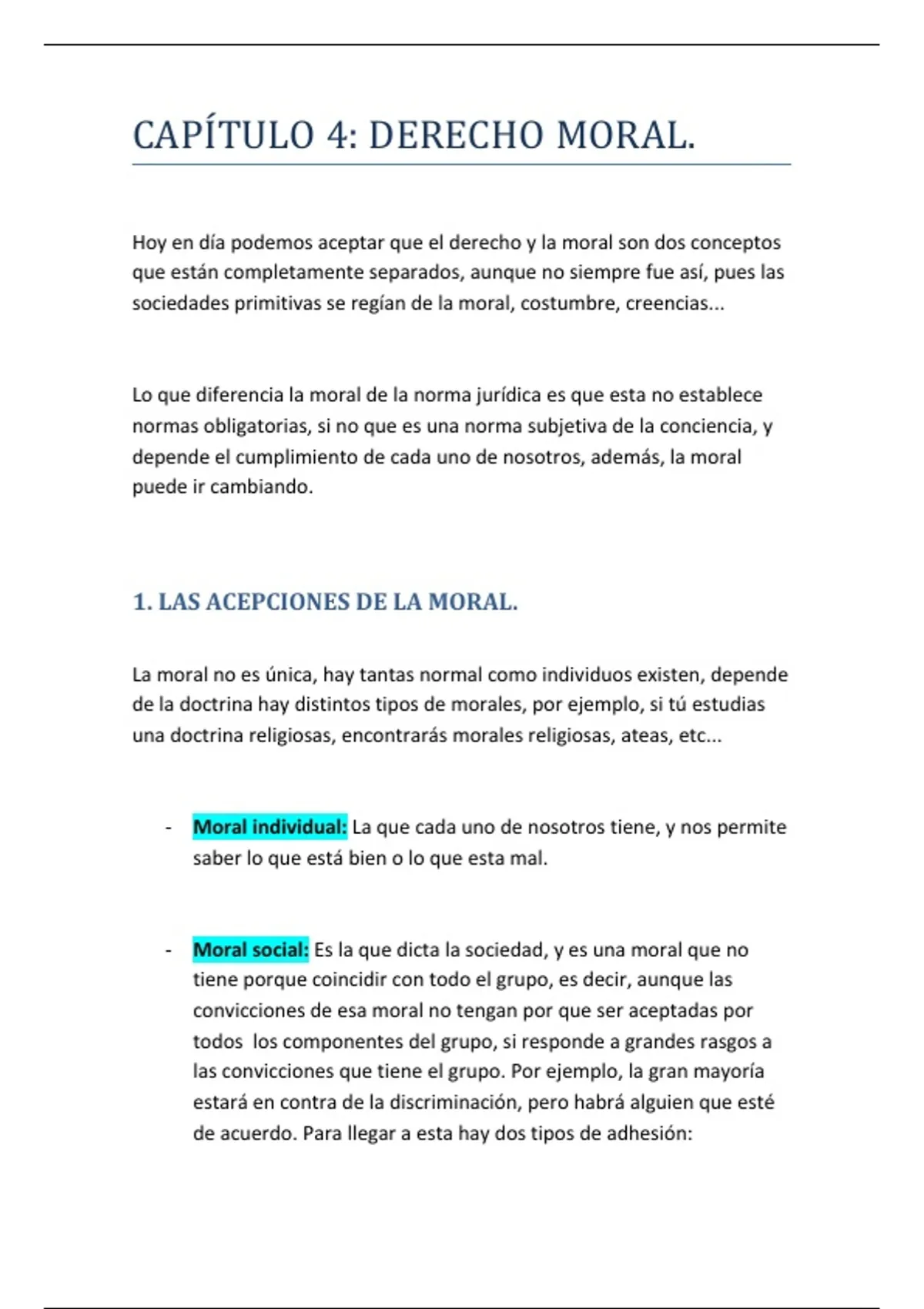 Este es un documento del capítulo 4 de Teoría del Derecho titulado "Derecho moral" de 4 páginas. Habla de las acepciones de la moral (dividiendo moral individual, social y universal) y de los 7 criterios de distinción entre el derecho y la moral. Es un documento colorido donde está bien explicado cada parte, y de rojo lo que es importante para el examen.