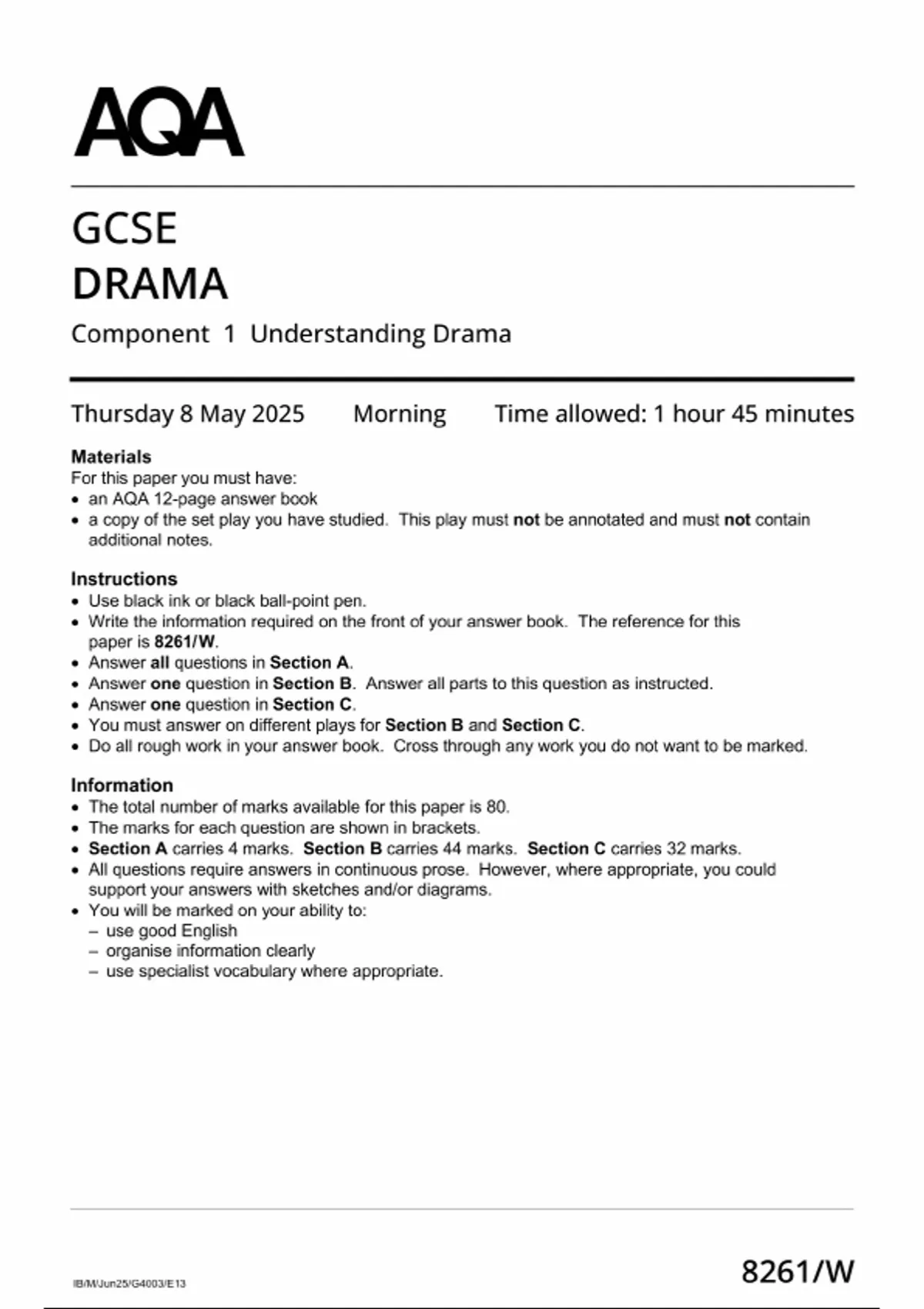 2025 AQA GCSE DRAMA PAPER 1 (8261/W: Understanding Drama).