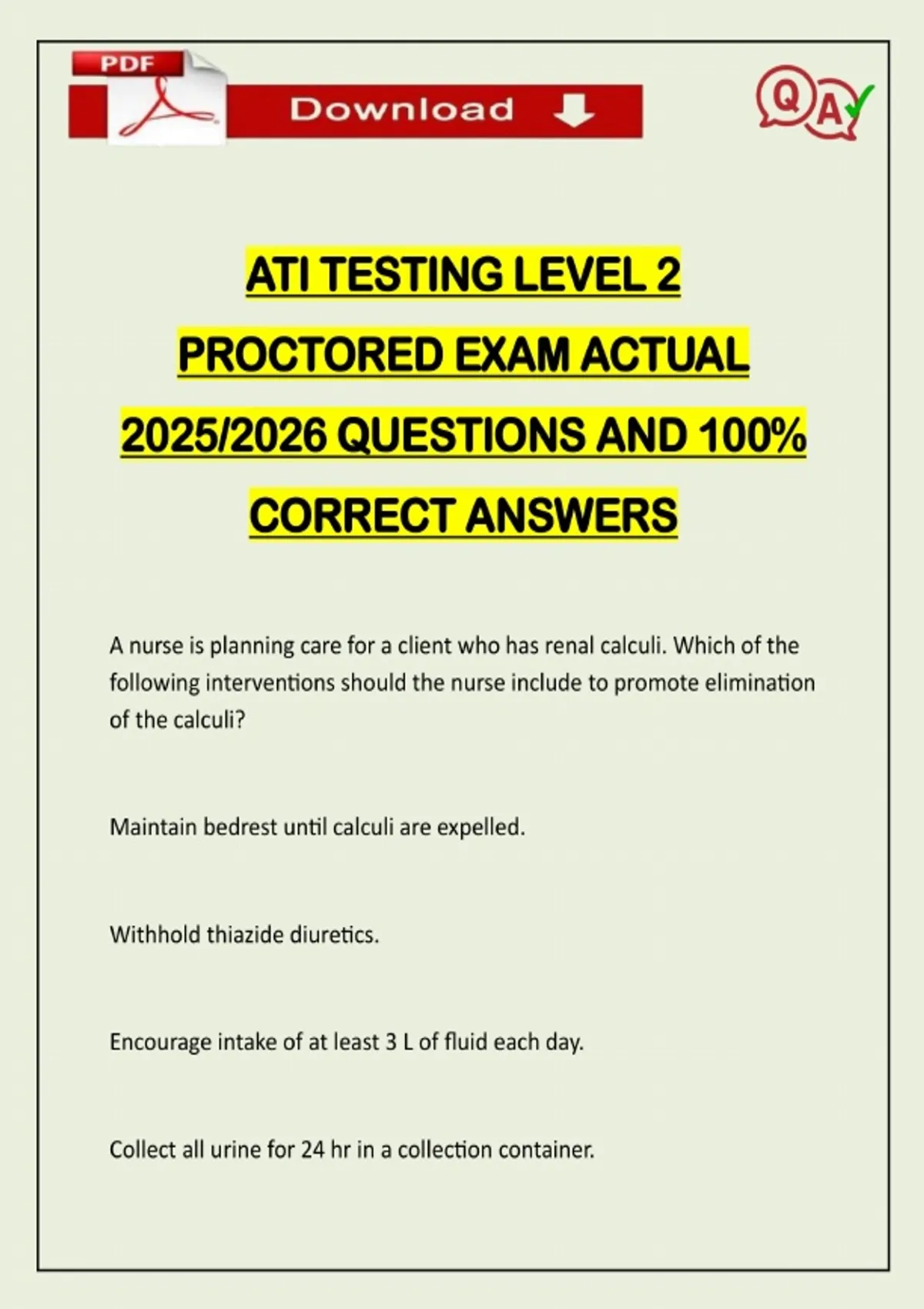 ATI TESTING LEVEL 2 PROCTORED EXAM ACTUAL 2025/2026 QUESTIONS AND 100% CORRECT ANSWERS A nurse is planning care for a client who has renal calculi. Which of the following interventions should the nurse include to promote elimination of the calculi? Maintain bedrest until calculi are expelled. Withhold thiazide diuretics. Encourage intake of at least 3 L of fluid each day. Collect all urine for 24 hr in a collection container.Need assistance on Online classes, Exams & Assignments? Reach out for instant help!! Full Course Assistance, Plagiarism-free Essay Writing, Research Paper, Dissertation, Discussion Posts, etc…. Confidential & Secure services. Tutors are available for all subjects! Email now at: - Answer -Encourage intake of at least 3 L of fluid each day. The nurse should encourage the client to consume at least 3 L of fluid each day. Increased fluid intake increases urine production, promotes eliminiation of calculi, and helps prevent recurrence. A nurse is providing postoperative education for a client following a laparoscopic cholecystectomy for cholelithiasis. Which of the following client statements indicates an understanding of the teaching? "The adhesive bandages on my incision wil