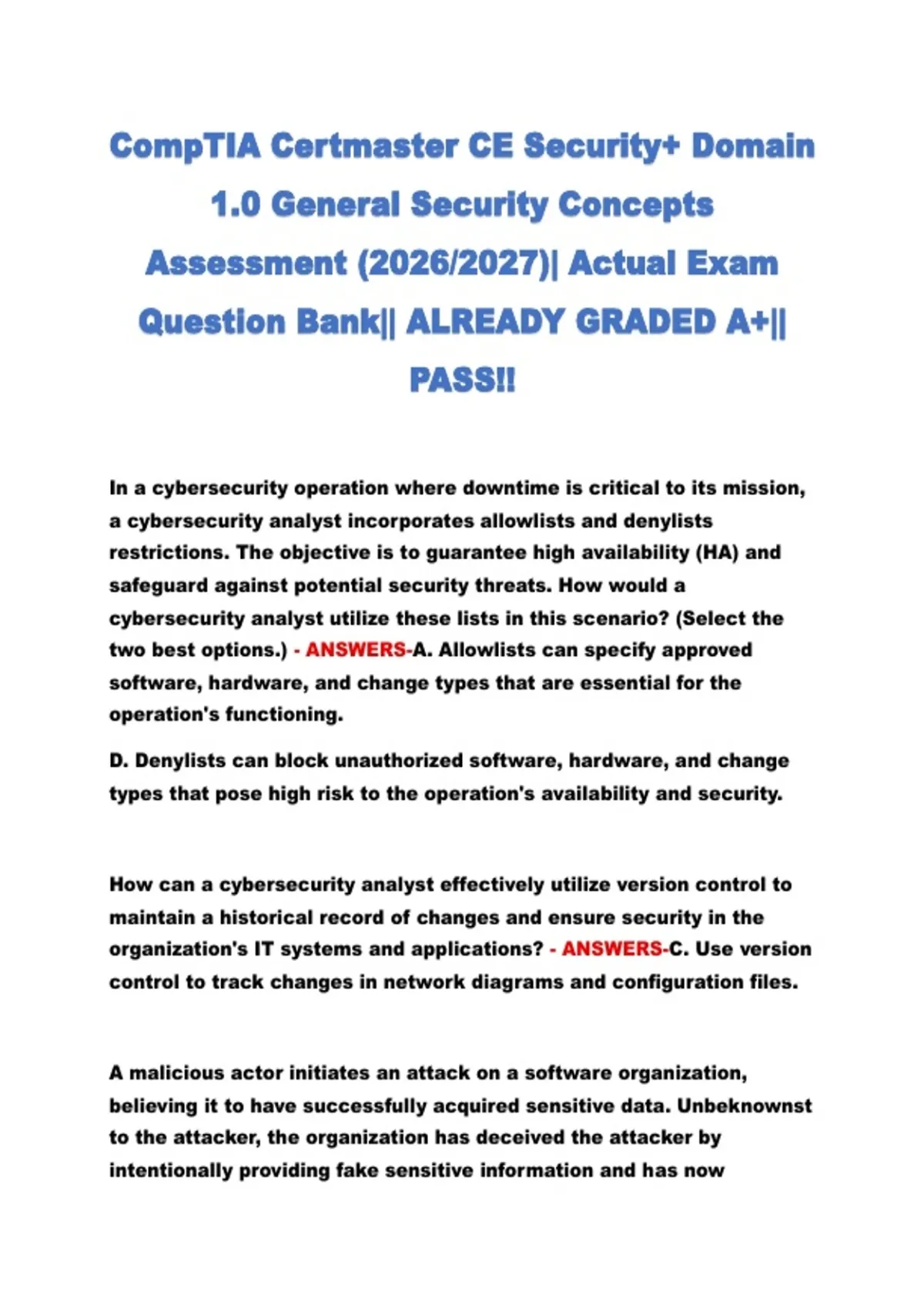CompTIA Certmaster CE Security+ Domain 1.0 General Security Concepts Assessment (2026/2027)| Actual Exam Question Bank|| ALREADY GRADED A+|| PASS!!