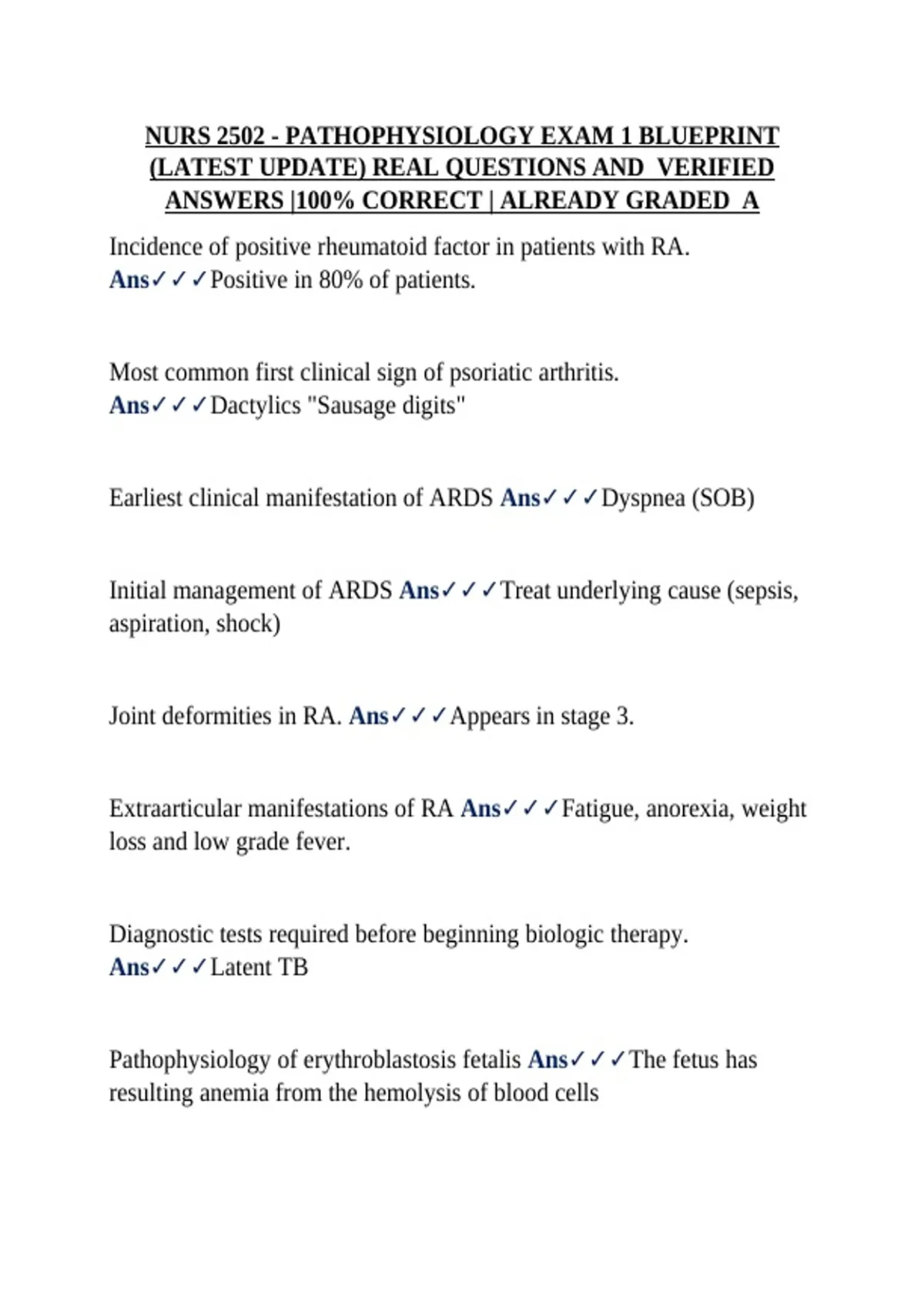 NURS 2502 - PATHOPHYSIOLOGY EXAM 1 BLUEPRINT (LATEST UPDATE) REAL QUESTIONS AND VERIFIED ANSWERS |100% CORRECT | ALREADY GRADED A