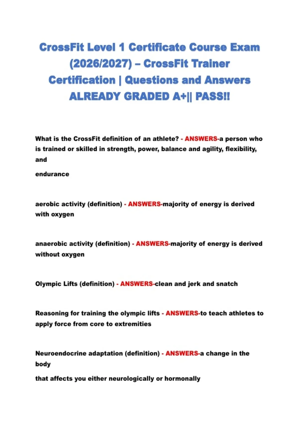 CrossFit Level 1 Certificate Course Exam (2026/2027) – CrossFit Trainer Certification | Questions and Answers ALREADY GRADED A+|| PASS!!