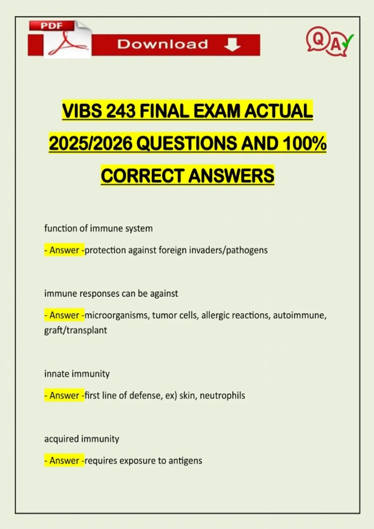 VIBS 243 FINAL EXAM ACTUAL 2025/2026 QUESTIONS AND 100% CORRECT ANSWERS function of immune system - Answer -protection against foreign invaders/pathogens immune responses can be against - Answer -microorganisms, tumor cells, allergic reactions, autoimmune, graft/transplant innate immunity - Answer -first line of defense, ex) skin, neutrophils acquired immunity - Answer -requires exposure to antigensNeed assistance on Online classes, Exams & Assignments? Reach out for instant help!! Full Course Assistance, Plagiarism-free Essay Writing, Research Paper, Dissertation, Discussion Posts, etc…. Confidential & Secure services. Tutors are available for all subjects! Email now at: antigens - Answer -molecular structure present on the outside of cells, viruses, and bacteria epitope