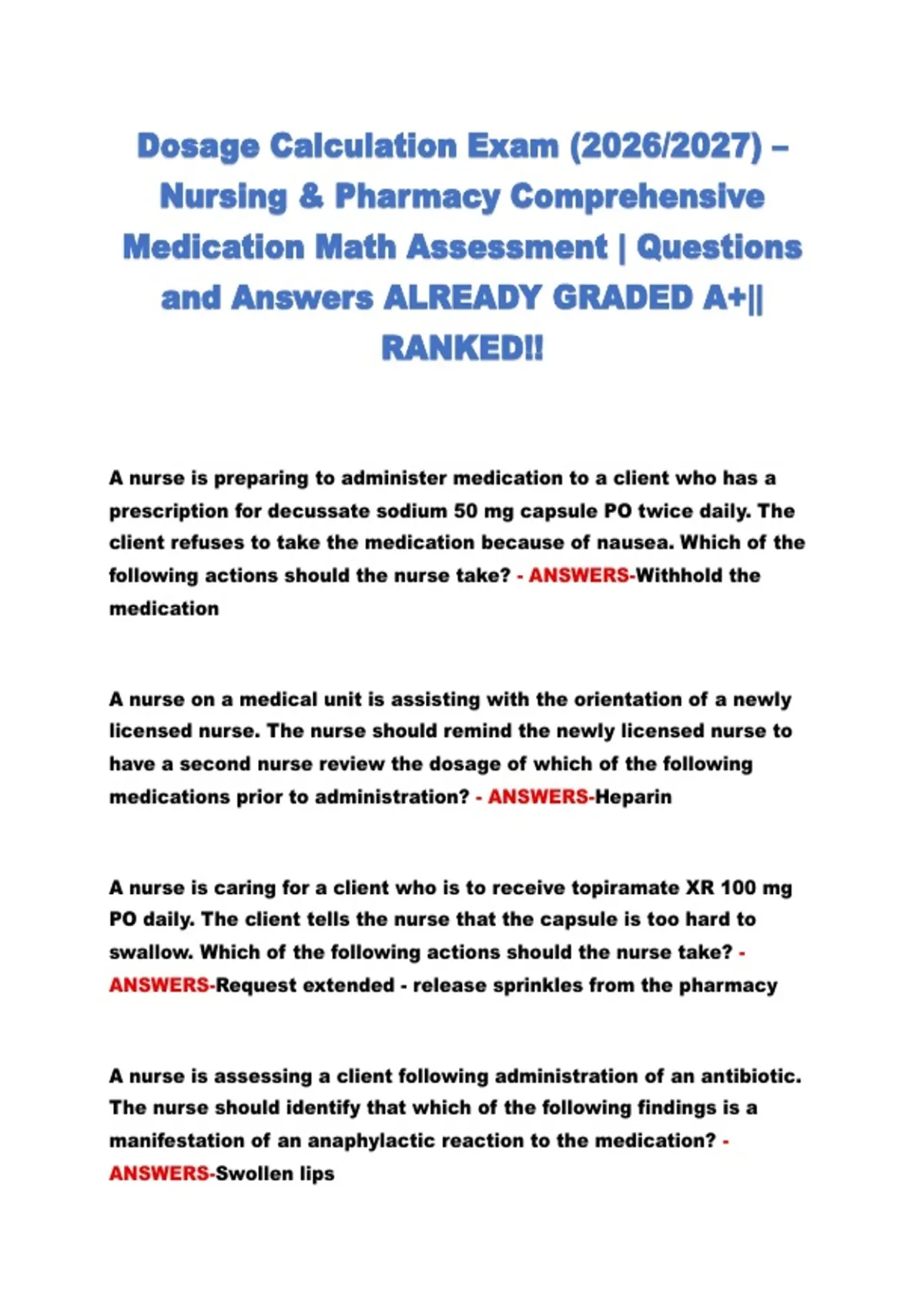 Dosage Calculation Exam (2026/2027) – Nursing & Pharmacy Comprehensive Medication Math Assessment | Questions and Answers ALREADY GRADED A+|| RANKED!!