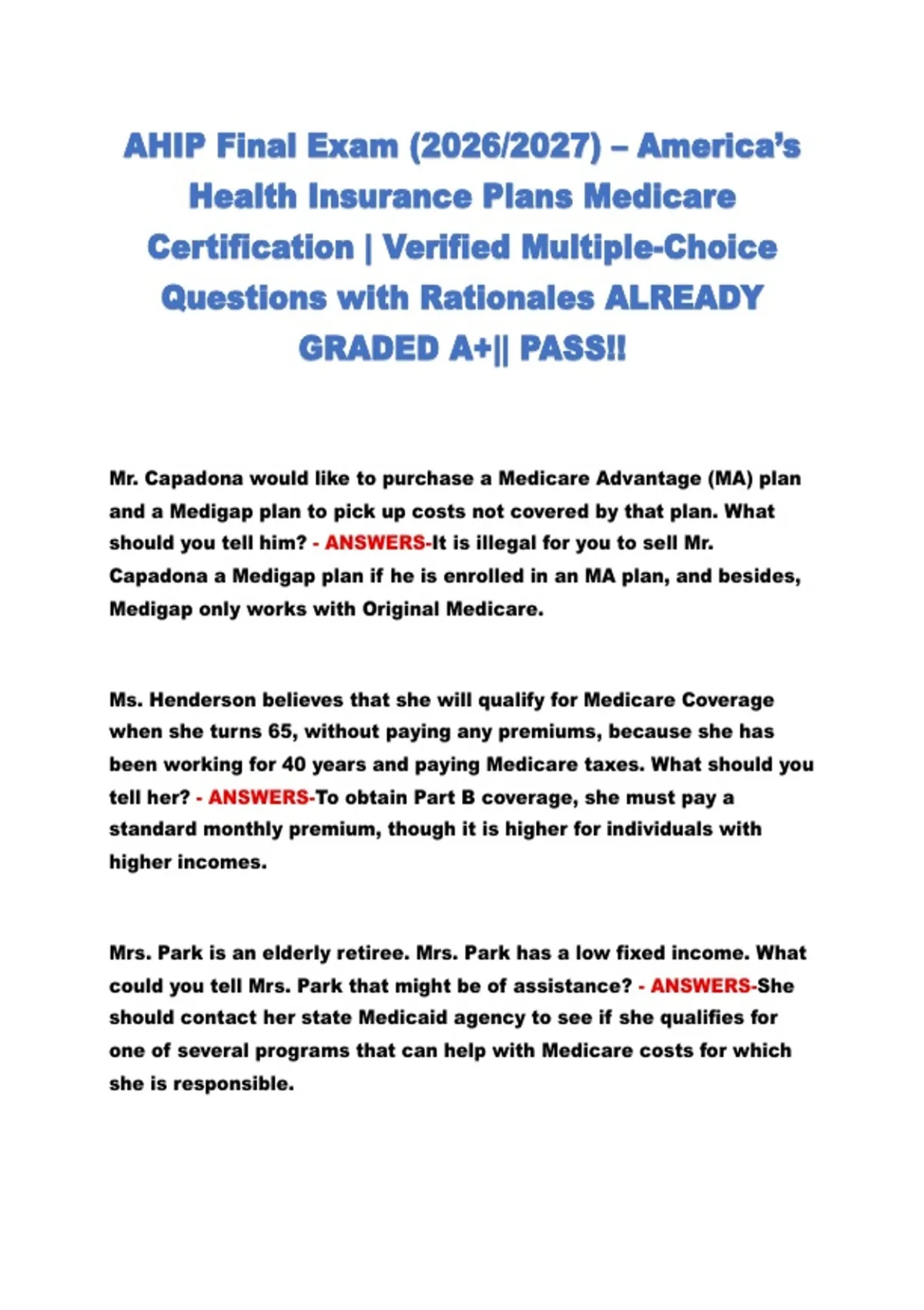 AHIP Final Exam (2026/2027) – America’s Health Insurance Plans Medicare Certification | Verified Multiple-Choice Questions with Rationales ALREADY GRADED A+|| PASS!!