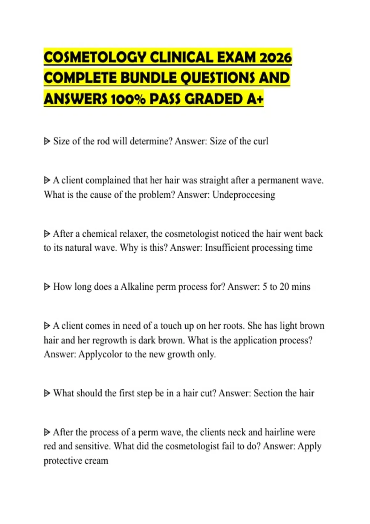 COSMETOLOGY CLINICAL EXAM 2026 COMPLETE BUNDLE QUESTIONS AND ANSWERS 100% PASS GRADED A+