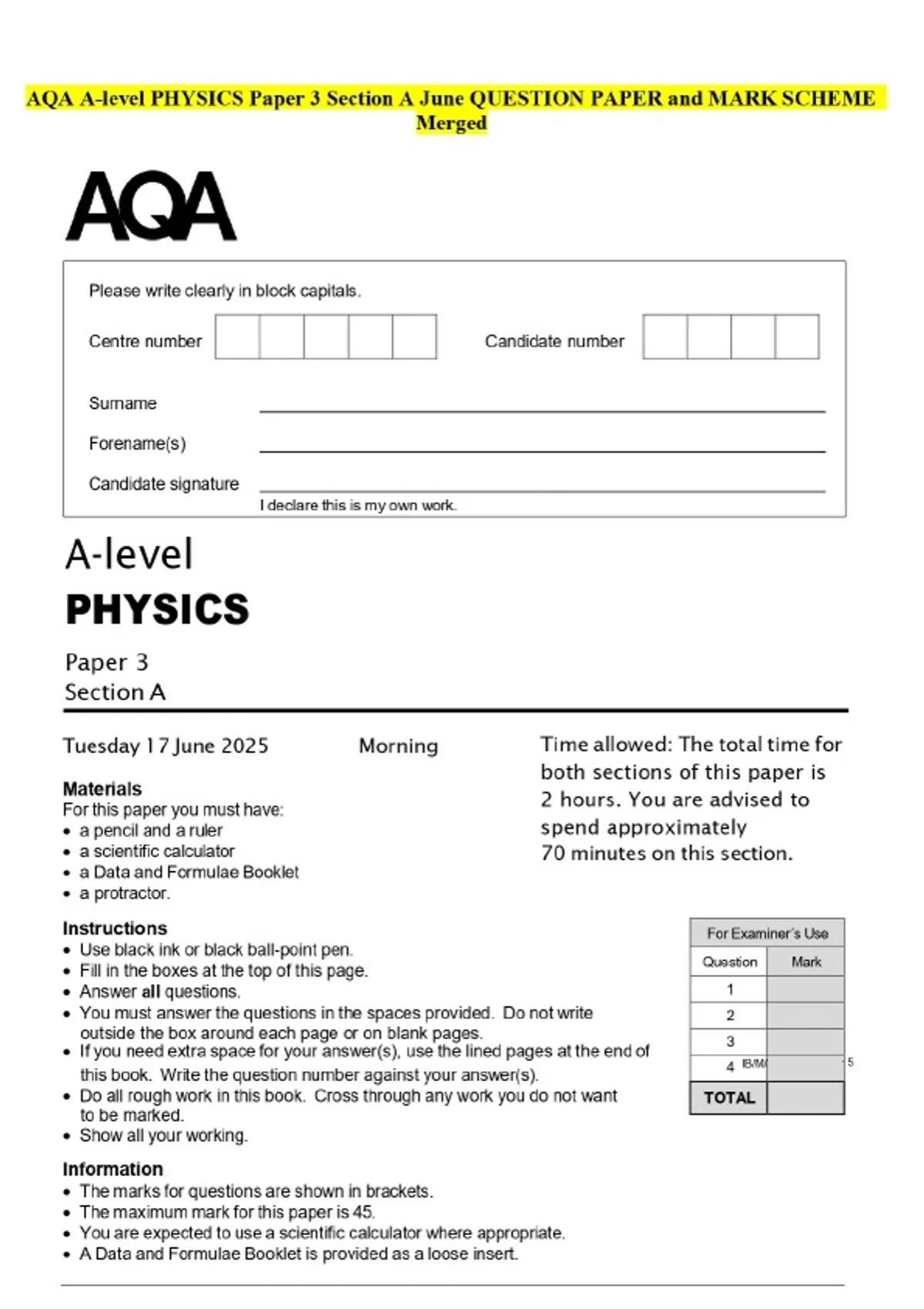 AQA A-level PHYSICS Paper 3 Section A June QUESTION PAPER and MARK SCHEME Merged