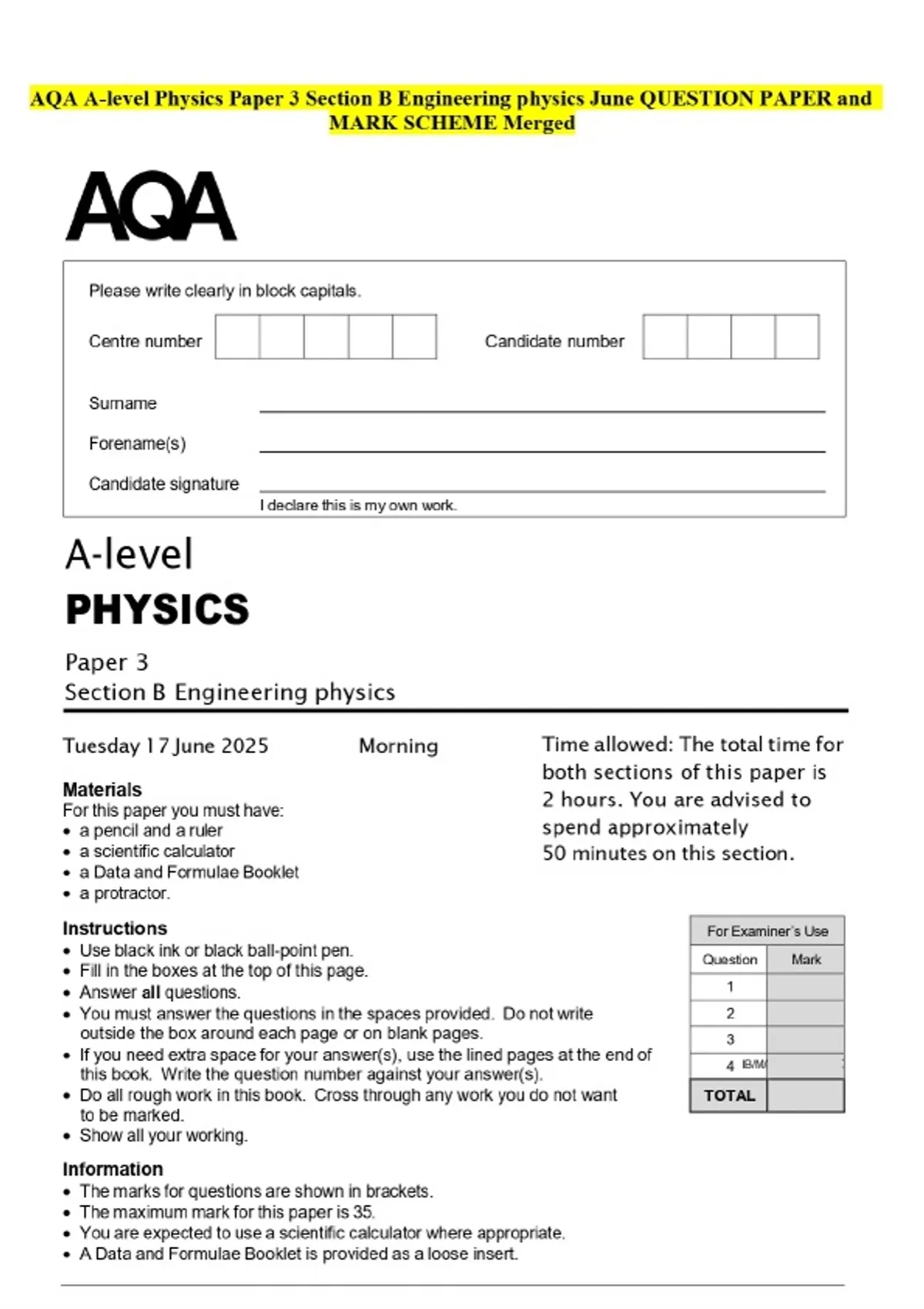 AQA A-level Physics Paper 3 Section B Engineering physics June QUESTION PAPER and MARK SCHEME Merged