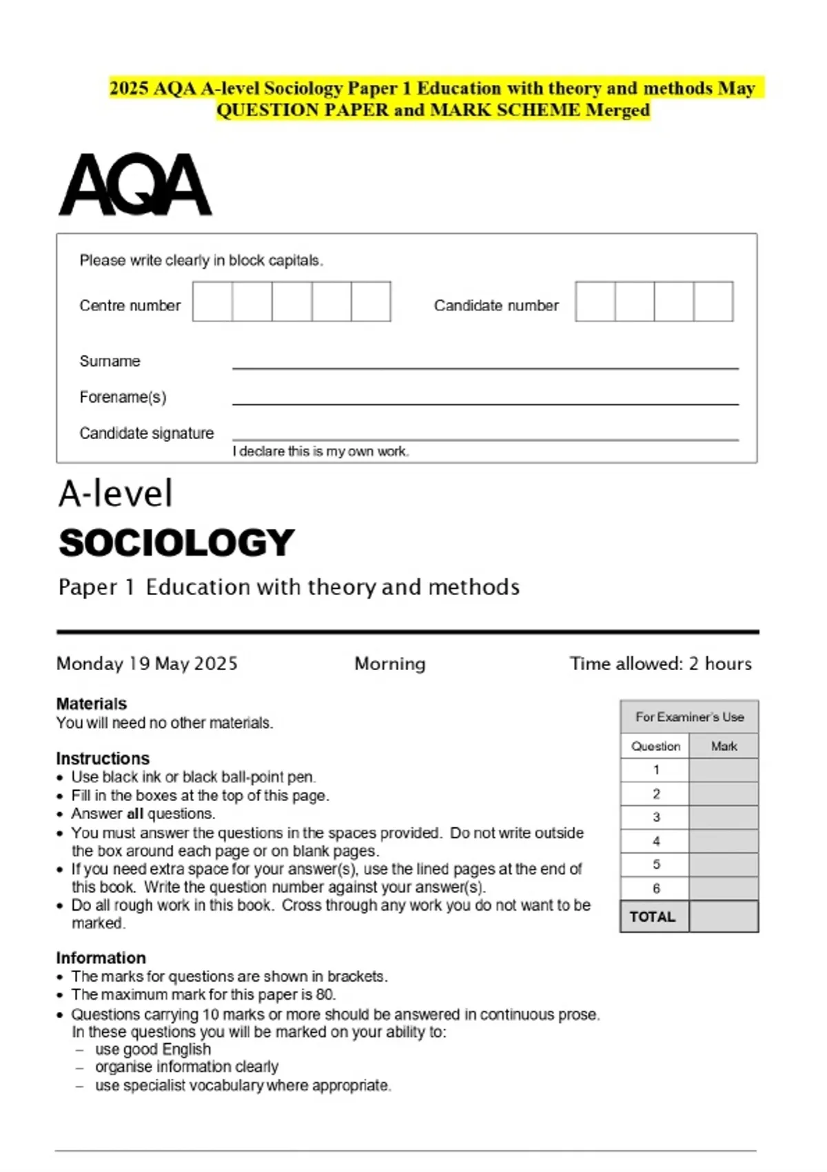 2025 AQA A-level Sociology Paper 1 Education with theory and methods May QUESTION PAPER and MARK SCHEME Merged