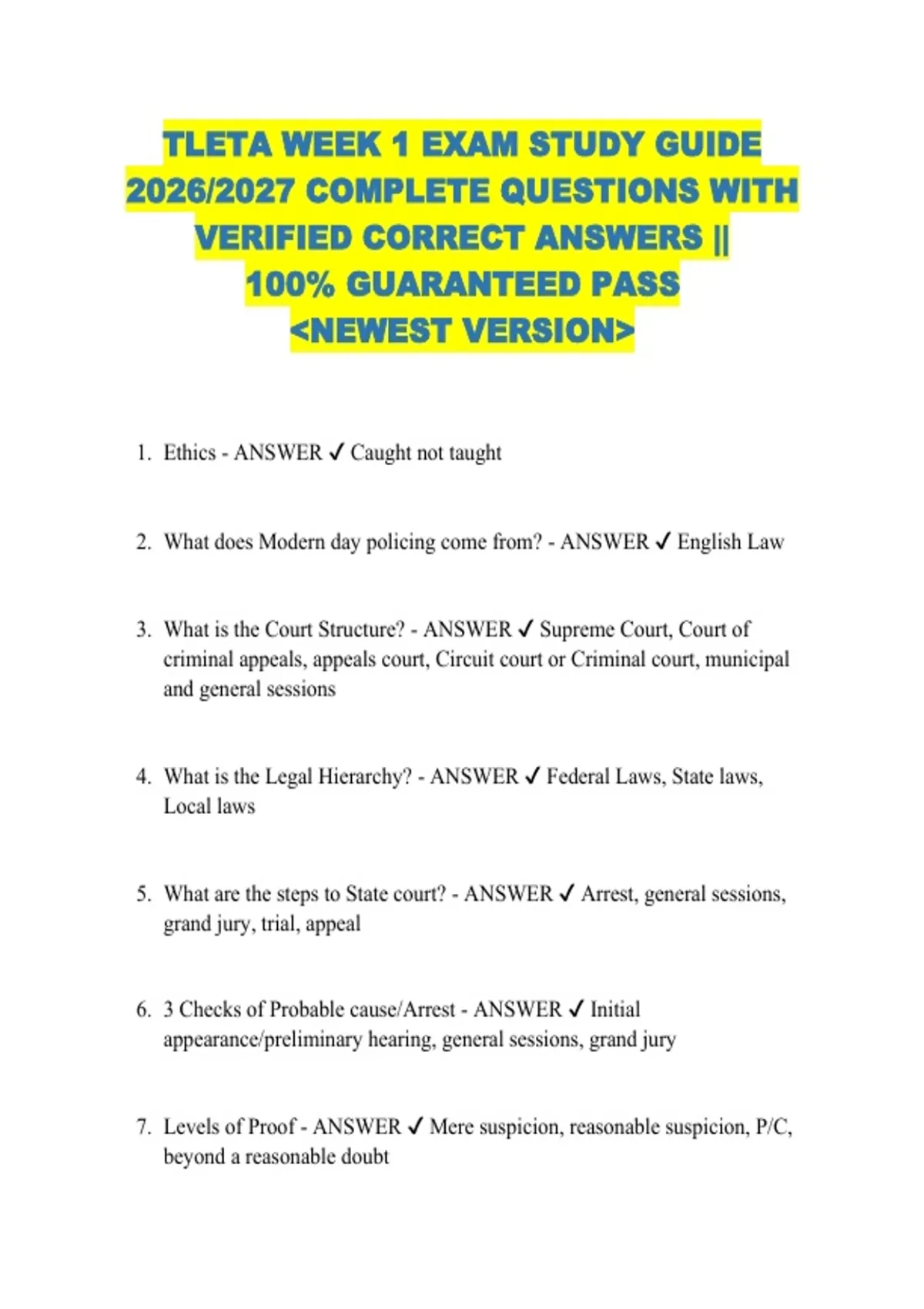 TLETA WEEK 1 EXAM STUDY GUIDE 2026/2027 COMPLETE QUESTIONS WITH VERIFIED CORRECT ANSWERS || 100% GUARANTEED PASS &lt;NEWEST VERSION&gt; 1. Ethics - ANSWER Caught not taught 2. What does Modern day policing come from? - ANSWER English Law 3. What is the Court Structure? - ANSWER Supreme Court, Court of criminal appeals, appeals court, Circuit court or Criminal court, municipal and general sessions 4. What is the Legal Hierarchy? - ANSWER Federal Laws, State laws, Local laws 5. What are the steps to State court? - ANSWER Arrest, general sessions, grand jury, trial, appeal 6. 3 Checks of Probable cause/Arrest - ANSWER Initial appearance/preliminary hearing, general sessions, grand jury 7. Levels of Proof - ANSWER Mere suspicion, reasonable suspicion, P/C, beyond a reasonable doubt 8. What is a magistrate? - ANSWER An officer having power to issue a warrant for the arrest of a person charged with a public offense 9. Who are considered magistrates? - ANSWER Judicial commissioners, judges of circuit & Criminal courts, Supreme Court, general sessions judges, city judges or juvenile judges 10. what is mittimus? - ANSWER Order in writing 11. What is the exclusionary rule? - ANSWER Must show exigent circumstances as above, but can't create exigent circumstances 12. What do you do in the case of In state Out of County Warrants? - ANSWER Evidence is in state but out of county Search warrant delivered to officer of the county where evidence is located for service, they should execute warrant, and you can be present 13. (Dillon v. State) - ANSWER When the search is conducted in foreign jurisdictions by independently acting outside agencies, the law of the outside jurisdiction determines validity 14. (State v. Cauley) - ANSWER Evidence used in TN courtroom obtained at the behest of TN authorities pursuant to their own investigation of a crime occurring within our utional search and seizure principles apply 15. Anticipatory Search Warrants - ANSWER Probable cause to believe that evidence of illegal activity will be found at a particular place at a time in the future ( Ex. arrival of a drug package) Affidavit should inform magistrate of known or suspected contraband delivered in immediate future and the basis for the affiant's knowledge Warrant be executed upon occurrence of specified event 16. Strip Search: - ANSWER to permit visual inspection of the genitals, buttocks, anus, female breasts or Having an arrested person remove or arrange some or all of the person's clothing so as undergarments of the arrested person Should not be done EXCEPT in cases involving weapons, a controlled substance or controlled substance analogue 17. To charge someone with a crime, you must have what 3 criteria? - ANSWER 1. elements of the offense are all met; 2. culpable mental state (depending on the offense), 3. meet jurisdiction requirements 18. What criminal code in TCA deals with offenses against persons? - ANSWER TCA 39-13 19. What criminal code in TCA deals with offenses against property? - ANSWER TCA 39-14 20. What criminal code in TCA deals with offenses against family? - ANSWER TCA 39-15 21. What criminal code in TCA deals with offenses against administration of the government? - ANSWER TCA 39-16 22. What criminal code in TCA deals with offenses against public health/safety/welfare? - ANSWER TCA 39-17 23. What criminal code in TCA deals with offenses against traffic laws? - ANSWER TCA 55 24. Criminal homicide is just a holding charge in TN until you can determine what? - ANSWER culpable mental state 25. Aggravated vs non-aggravated? - ANSWER aggravated -&gt; caused by weapons or injury 26. Burglary vs aggravated burglary? - ANSWER aggravated burglary contains the element of assault 27. What are the 2 major issues that get officers in trouble? - ANSWER one instructor says - criminal trespass and disorderly conduct; another instructor says - excessive force and false arrest (???) 28. When is theft a misdemeanor v felony? - ANSWER misdemeanor = property is $1000 or less; felony = property is more than $1000 29. Name the 3 types of statutory rape. - ANSWER 1. mitigated, 2. statutory, 3. aggravated 30. "Sexual penetration of a victim by the defendant (or vice versa) when the victim is 15-18 years old, and the defendant is 4-5 years older than the victim." = ? - ANSWER mitigated stat rape
