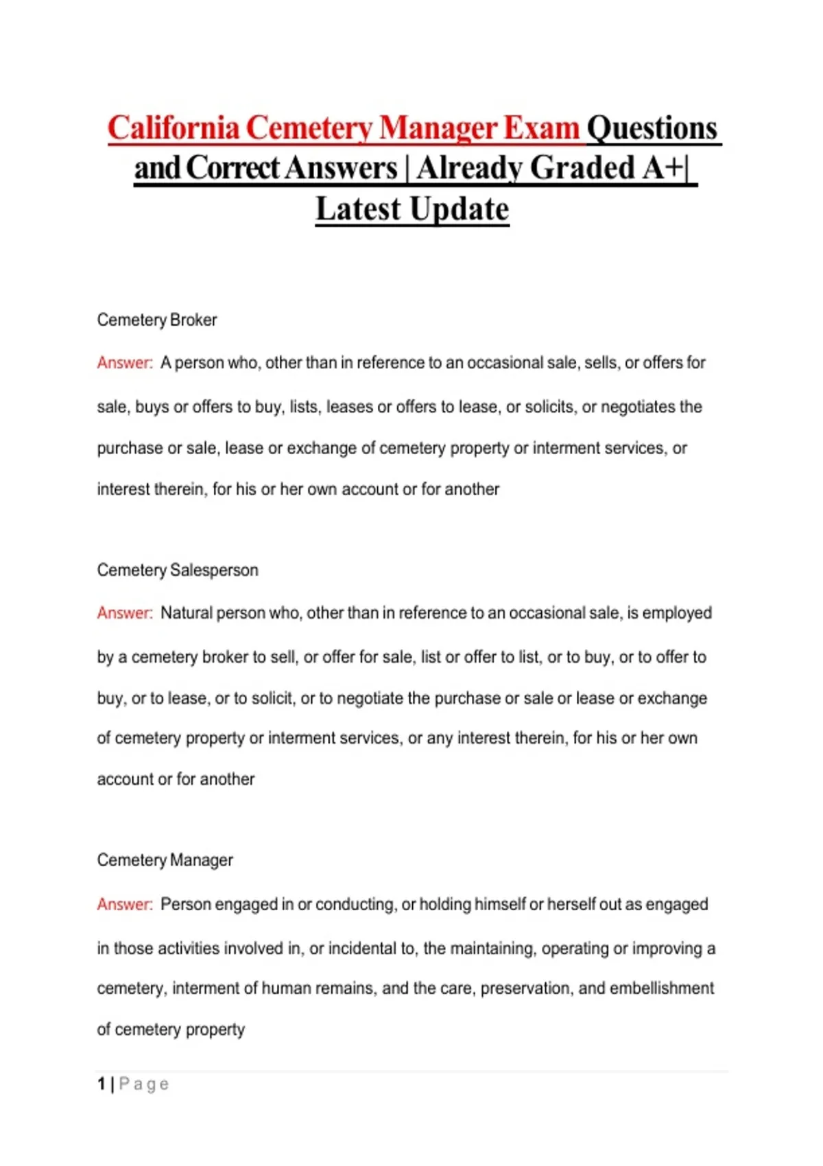 This document contains a comprehensive set of correctly answered questions covering the California Cemetery Manager Exam, including definitions, legal requirements, licensing rules, endowment care regulations, contracts, inspections, and disciplinary standards. It is suitable as a study guide, exam preparation resource, or last-minute review aligned with California state cemetery and crematory laws.