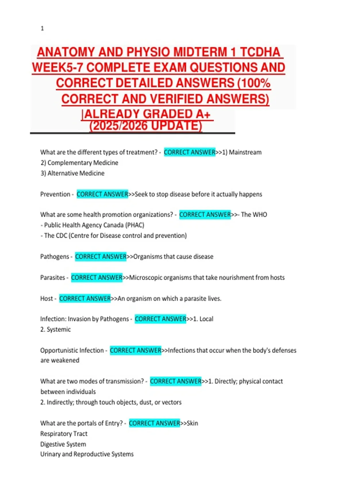 ANATOMY AND PHYSIO MIDTERM 1 TCDHA WEEK5-7 COMPLETE EXAM QUESTIONS AND CORRECT DETAILED ANSWERS (100% CORRECT AND VERIFIED ANSWERS) |ALREADY GRADED A+ (2025/2026 UPDATE)