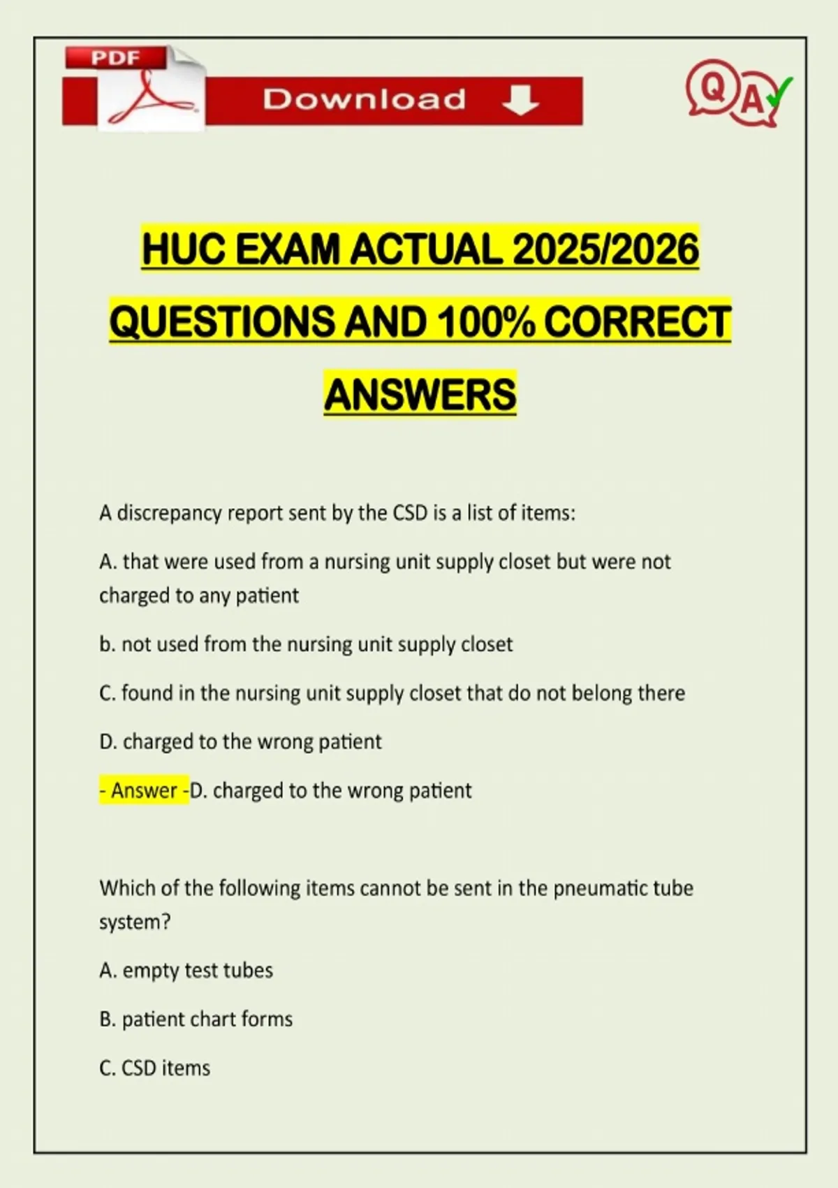 HUC EXAM ACTUAL 2025/2026 QUESTIONS AND 100% CORRECT ANSWERS A discrepancy report sent by the CSD is a list of items: A. that were used from a nursing unit supply closet but were not charged to any patient b. not used from the nursing unit supply closet C. found in the nursing unit supply closet that do not belong there D. charged to the wrong patient - Answer -D. charged to the wrong patient Which of the following items cannot be sent in the pneumatic tube system? A. empty test tubes B. patient chart forms C. CSD itemsNeed assistance on Online classes, Exams & Assignments? Reach out for instant help!! Full Course Assistance, Plagiarism-free Essay Writing, Research Paper, Dissertation, Discussion Posts, etc…. Confidential & Secure services. Tutors are available for all subjects! Email now at: D.CSF - Answer -D. CSF The printer in the nursing station is not functioning properly. The HUC would notify the: A. director of nurses B.computer training instructo