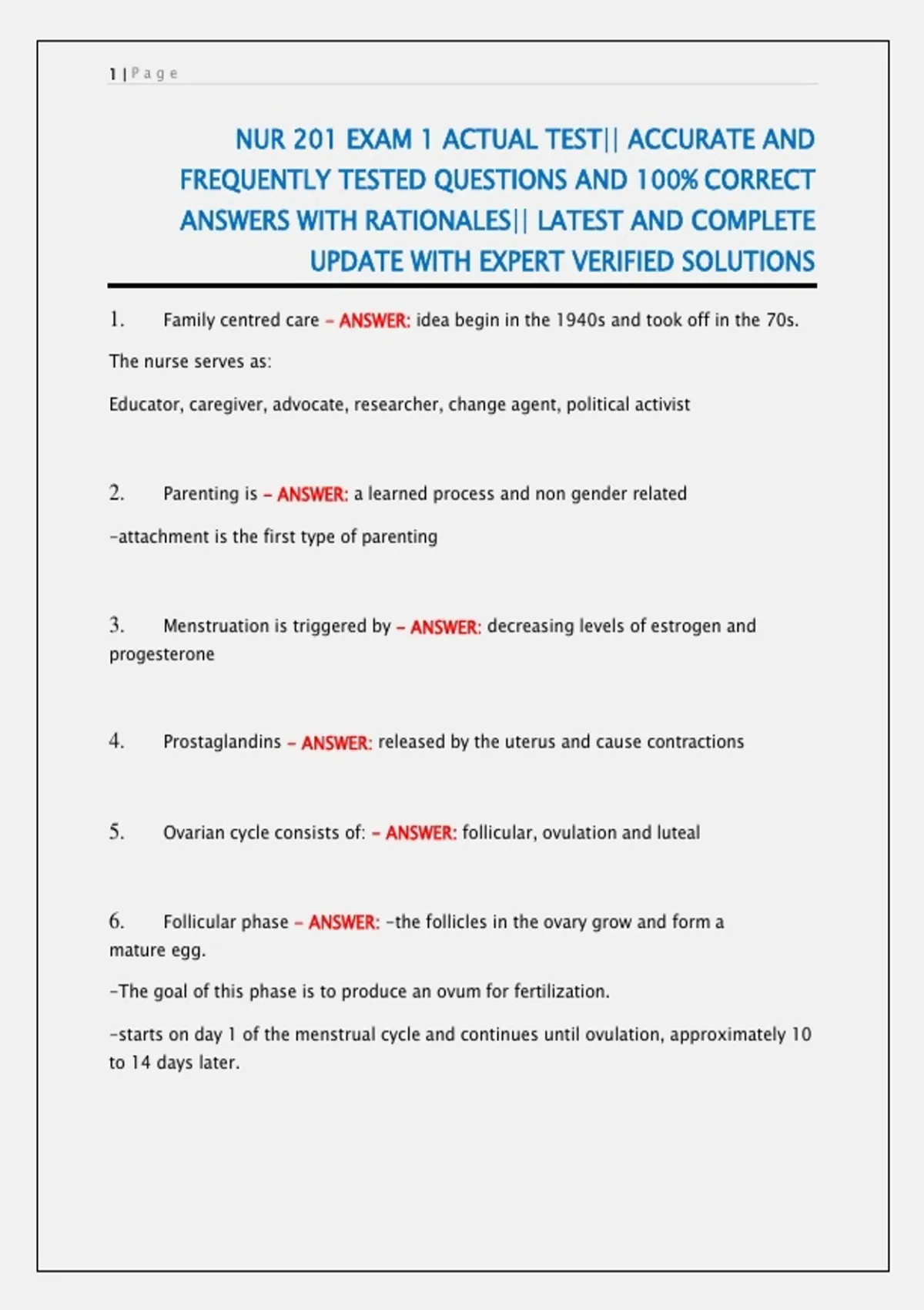 The NUR 201 Exam 1 Actual Test Questions and Answers 2025 resource provides accurate, frequently tested exam questions with 100% correct answers and detailed rationales. Covering foundational nursing concepts such as patient safety, nursing process, basic assessment, communication, documentation, and clinical judgment, this comprehensive study guide strengthens understanding, improves exam readiness, and supports successful performance in NUR 201 nursing courses.