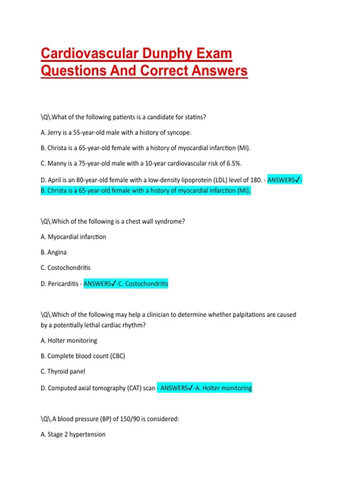 Cardiovascular Dunphy Exam Questions And Correct Answers Q.What of the following patients is a candidate for statins? A. Jerry is a 55-year-old male with a history of syncope. B. Christa is a 65-year-old female with a history of myocardial infarction (MI). C. Manny is a 75-year-old male with a 10-year cardiovascular risk of 6.5%. D. April is an 80-year-old female with a low-density lipoprotein (LDL) level of 180. - ANSWERS-B. Christa is a 65-year-old female with a history of myocardial infarction (MI). Q.Which of the following is a chest wall syndrome? A. Myocardial infarction B. Angina C. Costochondritis D. Pericarditis - ANSWERS-C. Costochondritis Q.Which of the following may help a clinician to determine whether palpitations are caused by a potentially lethal cardiac rhythm? A. Holter monitoring B. Complete blood count (CBC) C. Thyroid panel D. Computed axial tomography (CAT) scan - ANSWERS-A. Holter monitoring Q.A blood pressure (BP) of 150/90 is considered: A. Stage 2 hypertension B. Hypertensive C. Normal in healthy older adults D. Acceptable if the patient has diabetes mellitus (DM) - ANSWERS-C. Normal in healthy older adults Q.Lifestyle modifications to manage hypertension (HTN) include: A. Maintaining a body mass index of 17 B. Restricting dietary sodium to 5 grams per day C. Engaging in exercise or physical activity for 90 minutes a day D. Limiting beer intake to 24 ounces per day - ANSWERS-D. Limiting beer intake to 24 ounces per day Q.Mary has hypertension and previously had a stroke. Which hypertensive drug has been shown to reduce stroke? A. Chlorthalidone B. Metoprolol C. Amlodipine D. Losartan - ANSWERS-A. Chlorthalidone Q.Which high-density lipoprotein (HDL) level is considered cardioprotective? A. Greater than 30 B. Greater than 40 C. Greater than 50 D. Greater than 60 - ANSWERS-D. Greater than 60 Q.You are assessing Sigred for metabolic syndrome. Which of her parameters is indicative of this syndrome? A. Her waist is 36 inches. B. Her triglyceride level is 140 mg/dL. C. Her BP is 128/84. D. Her fasting blood sugar (BS) is 108 mg/dL. - ANSWERS-A. Her waist is 36 inches. Q.Which type of angina do you suspect in Harvey, who complains of chest pain that occurs during sleep and most often in the early morning hours? A. Stable angina B. Unstable angina C. Variant (Prinzmetal's angina) D. Probably not angina but hiatal hernia - ANSWERS-C. Variant (Prinzmetal's angina) Q.A patient is undergoing a cardiac stress test. Which of the following parts of their history could cause a false-positive reading? A. Patient is on labetalol. B. Patient is a man. C. Patient is on amlodipine. D. Patient has a potassium level of 4. - ANSWERS-A. Patient is on labetalol. Q.Which of these patients is at a higher risk for developing deep vein thrombosis? A. Jerry, a 64-year-old man with a history of epilepsy B. Samantha, a 45-year-old female undergoing a hysterectomy C. Diane, a 15-year-old female with type 1 diabetes D. Ben, a 23-year-old male with a history of a pneumothorax - ANSWERS-B. Samantha, a 45-year-old female undergoing a hysterectomy