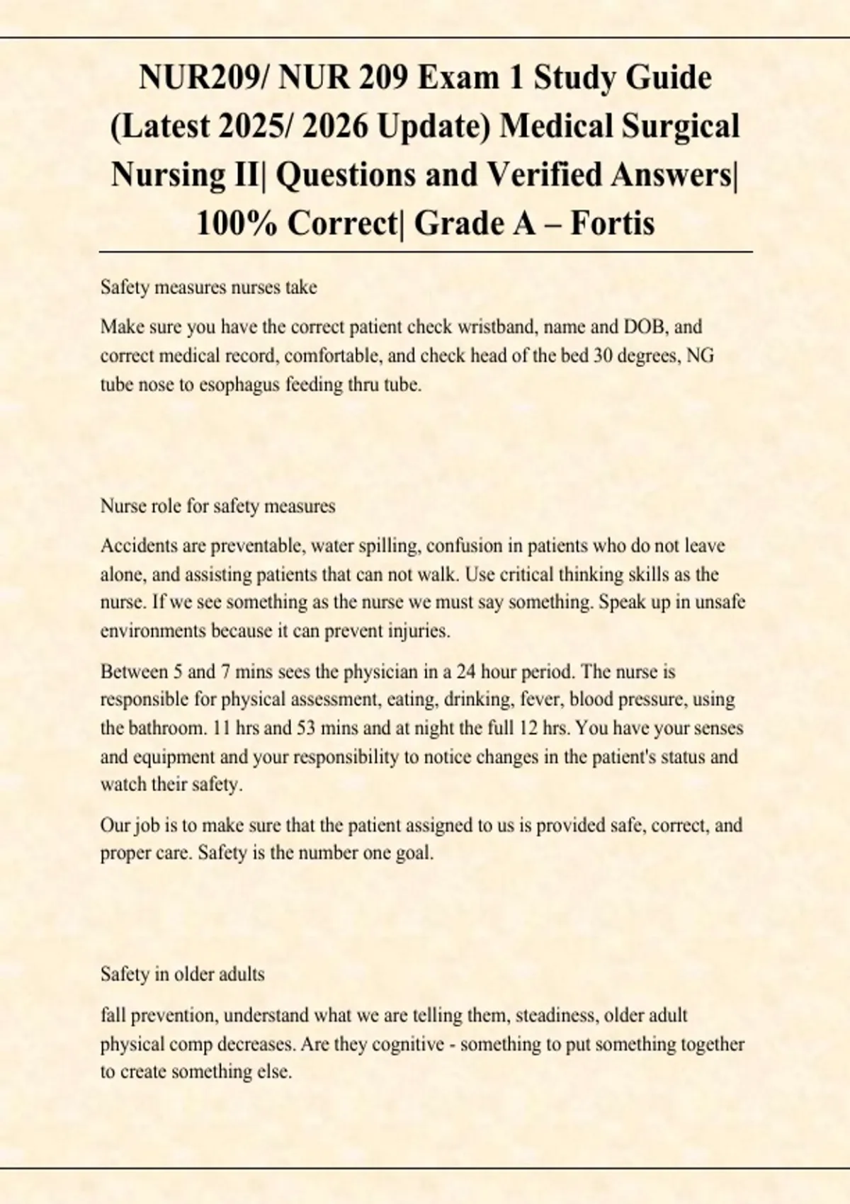 This document is a complete and updated study guide for NUR 209 (Medical Surgical Nursing II) Exam 1 at Fortis College, reflecting the latest 2025–2026 curriculum. It includes exam-focused questions with 100% verified correct answers to support understanding of core med-surg concepts and clinical application. The guide is ideal for nursing students preparing for Exam 1, offering a Grade A resource aligned with course objectives and nursing exam standards.