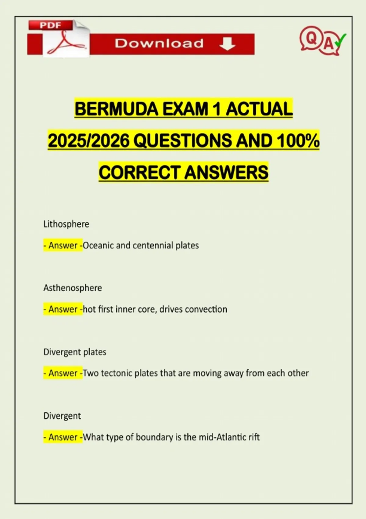 BERMUDA EXAM 1 ACTUAL 2025/2026 QUESTIONS AND 100% CORRECT ANSWERS Lithosphere - Answer -Oceanic and centennial plates Asthenosphere - Answer -hot first inner core, drives convection Divergent plates - Answer -Two tectonic plates that are moving away from each other Divergent - Answer -What type of bound