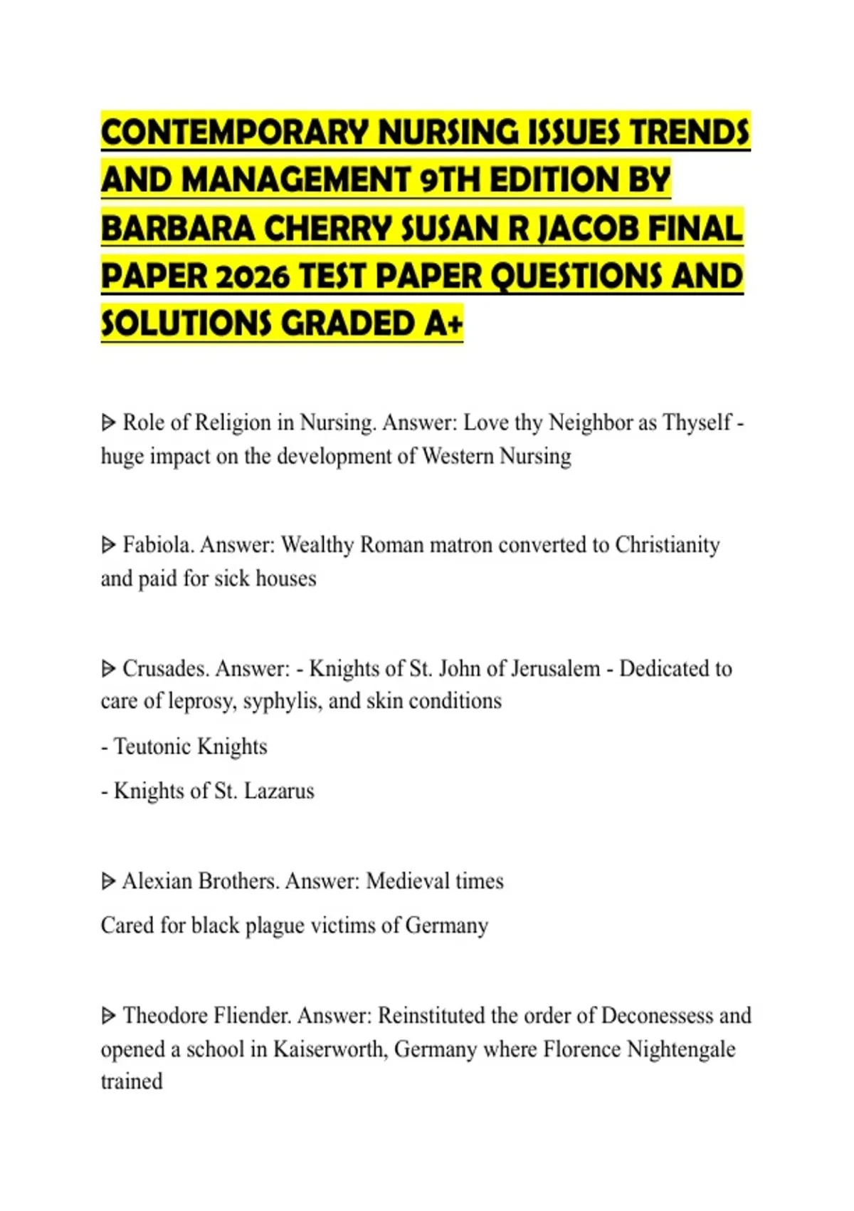 CONTEMPORARY NURSING ISSUES TRENDS AND MANAGEMENT 9TH EDITION BY BARBARA CHERRY SUSAN R JACOB FINAL PAPER 2026 TEST PAPER QUESTIONS AND SOLUTIONS GRADED A+