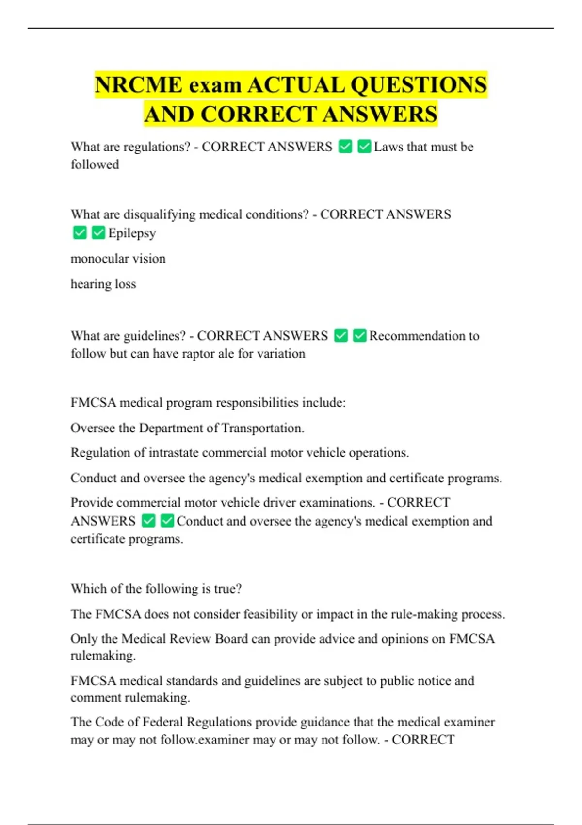 Medical Examiner. - CORRECT ANSWERS FMCSA guidance