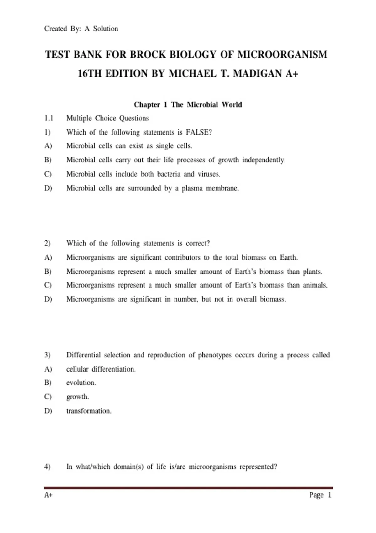 Brock Biology of Microorganisms 16th Edition Test Bank by Madigan, All Chapters Covered
