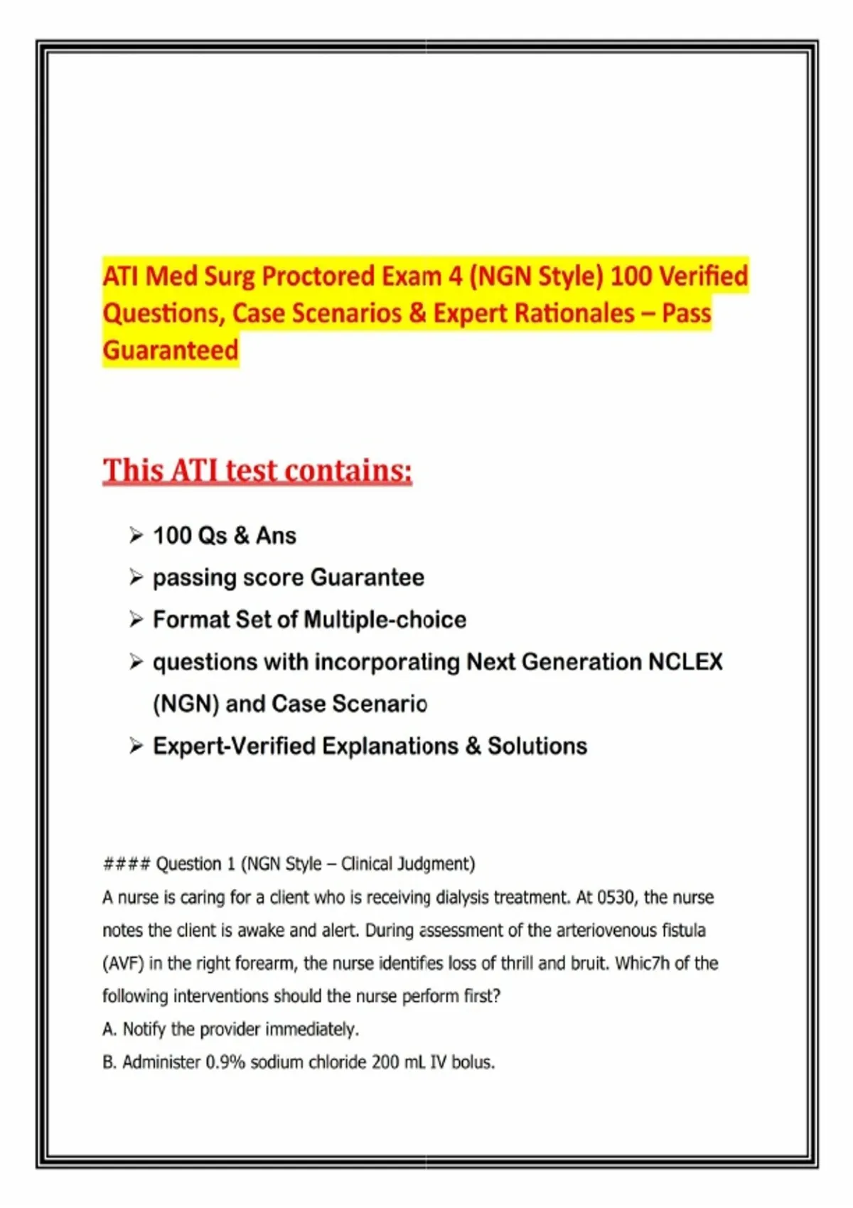 ATI Med Surg Proctored Exam 4 (NGN Style) 100 Verified Questions, Case Scenarios & Expert Rationales – Pass GuaranteedPrepare thoroughly for your ATI Medical-Surgical Proctored Exam 4 with this Next Generation NCLEX (NGN) style resource, designed to mirror the actual exam format and guarantee success. This prep set includes 100 verified med-surg nursing questions, case scenarios, and expert‑written rationales to ensure you’re ready to pass on the first attempt. Features: - 100 Actual Med-Surg Nursing Questions & Answers with structured rationales - NGN‑Style Case Scenarios & Select‑All‑That‑Apply Items integrated throughout - Expert‑Verified Rationales explaining correct and incorrect answers - Evidence‑Based Content aligned with ATI and NCLEX standards - 100% Pass Guarantee for exam readiness - Accessible Format for flexible study anytime, anywhere Sample Topics Covered: - Renal & Dialysis: AV fistula assessment, loss of thrill/bruit, nephrostomy tube complications - Postoperative Care: Splinting abdomen, early ambulation, pain assessment, urinary output monitoring - Nutrition & IV Therapy: TPN management, dextrose 10% infusion when bag unavailable - Neurology: Seizure management (side-lying positioning), stroke priority findings - Cardiovascular & Hemodynamics: Hypovolemia recognition, fluid challenge, monitoring urine output and BP - Pharmacology: Propranolol adverse effects (bronchospasm), ginkgo biloba bleeding risk - Endocrine Disorders: Graves’ disease (exophthalmos), hypothyroidism (constipation), diabetic ketoacidosis improvement markers - Wound Care: Proper irrigation technique for granulating pressure injuries - Blood Transfusion Safety: Verification of blood units with another nurse before administration - Mobility & Rehabilitation: Correct crutch-walking technique for climbing stai
