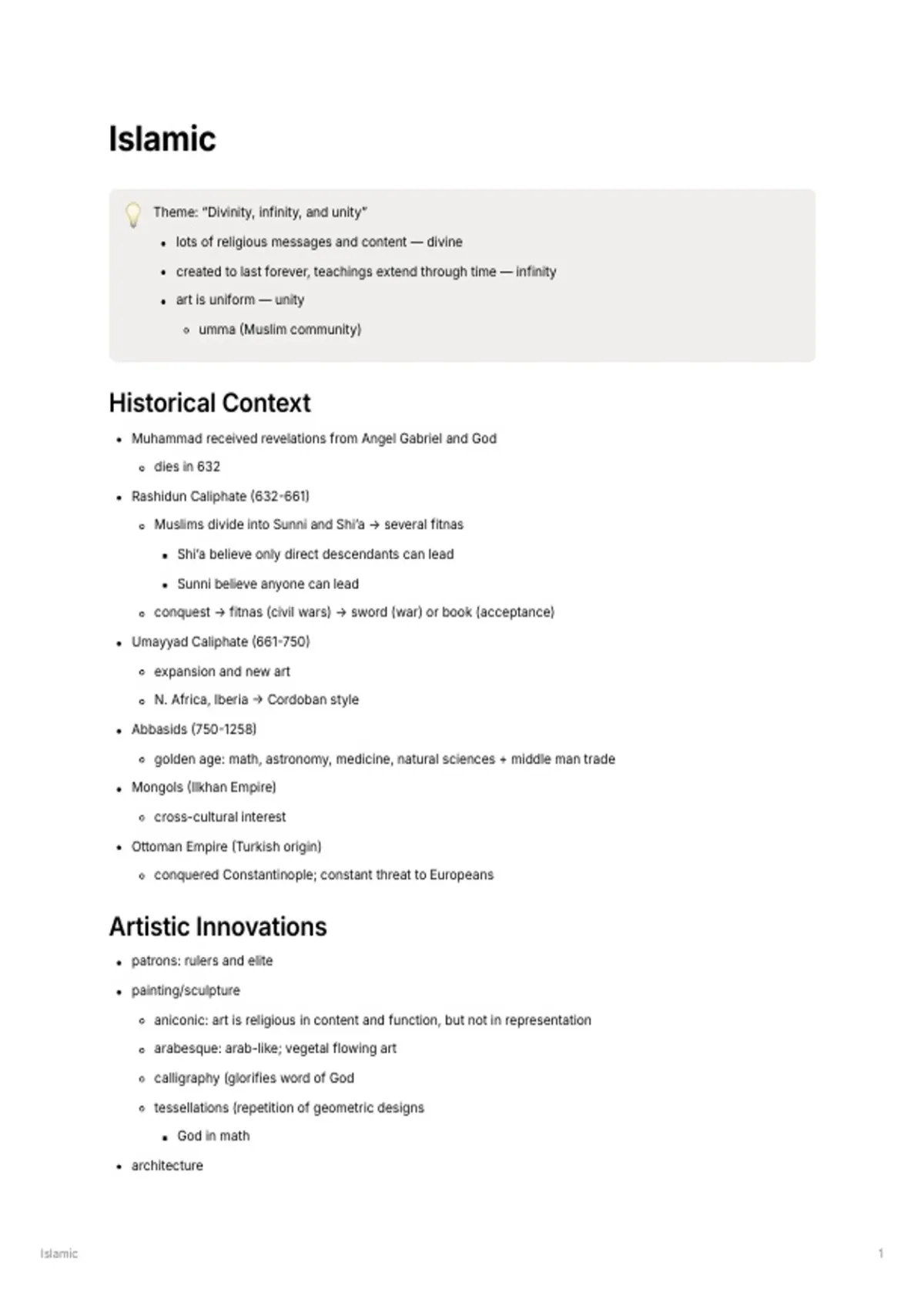 Unit 8: Islamic Art Notes written for AP Art History. Formatted by form, function, content, and context. Includes all required artworks by College Board including sub-works.