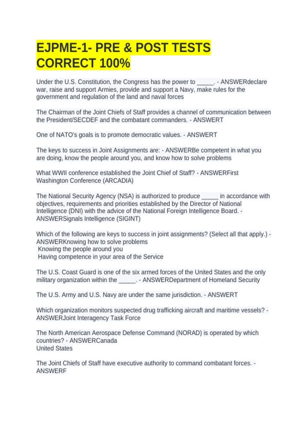 Under the U.S. Constitution, the Congress has the power to _____. - ANSWERdeclare war, raise and support Armies, provide and support a Navy, make rules for the government and regulation of the land and naval forces The Chairman of the Joint Chiefs of Staff provides a channel of communication between the President/SECDEF and the combatant commanders. - ANSWERT One of NATO's goals is to promote democratic values. - ANSWERT