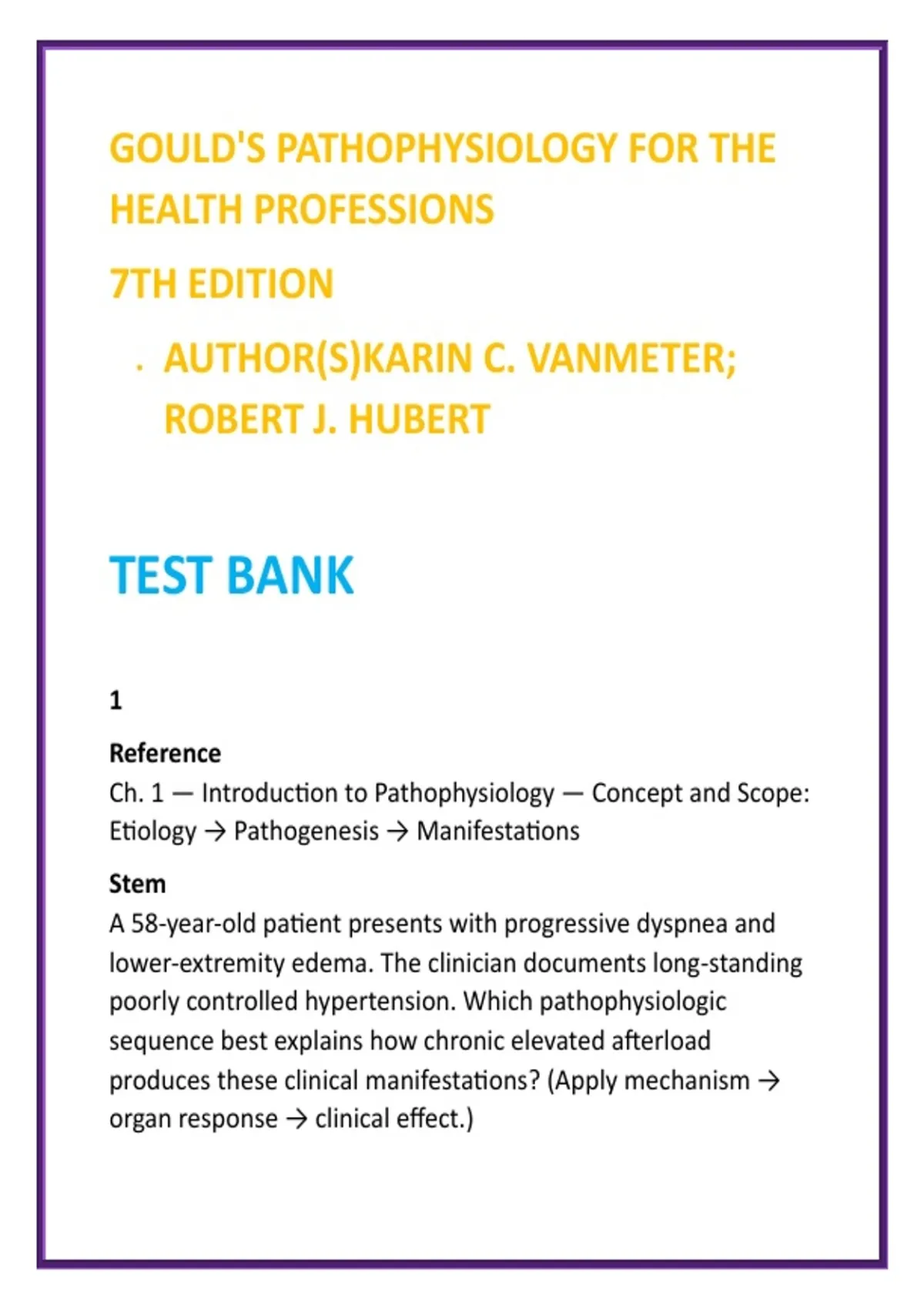Gould’s Pathophysiology Test Bank (7th Ed) | VanMeter & Hubert | Pathophysiology MCQs for Health Professions 2) SEO Product Description (200–300 words) Master pathophysiology with confidence using this comprehensive, exam-ready test bank aligned to Gould’s Pathophysiology for the Health Professions, 7th Edition by VanMeter & Hubert—one of the most trusted and widely adopted texts in health sciences education. This digital test bank provides full textbook coverage across all units and chapters, delivering 20 high-quality multiple-choice questions (MCQs) per chapter specifically designed to reinforce disease mechanisms, pathogenesis, and clinical manifestations. Every question is paired with clear, evidence-based rationales that explain why an answer is correct—helping learners move beyond memorization to true clinical understanding. Each item emphasizes pathophysiologic reasoning, cause-and-effect relationships, and early clinical application, making this resource ideal for students preparing for unit exams, cumulative finals, and licensure-style assessments. Questions are written at the appropriate depth for undergraduate and pre-clinical learners, supporting both foundational mastery and applied reasoning. Key Features: Full coverage of all chapters and body systems 20 clinically accurate MCQs per chapter Verified correct answers with mechanism-focused rationales Emphasis on etiology, disease progression, and manifestations Designed to save study time while maximizing exam performance Digital format for immediate access and repeated practice Ideal For: Pathophysiology for Health Professions courses Practical Nursing (PN/LPN) and Registered Nursing (ADN/BSN) programs Physician Assistant (PA) and Physical Therapy (PT/DPT) programs Respiratory Therapy, Radiologic Sciences, and Medical Laboratory Sciences Allied Health and Pre-Clinical students seeking concept mastery This test bank transforms Gould’s gold-standard content into a powerful, exam-focused learning tool—built to strengthen understanding, boost confidence, and improve outcomes. 3) High-Value SEO Keywords (8) Gould’s pathophysiology test bank VanMeter Hubert pathophysiology pathophysiology MCQs for health professions Gould’s pathophysiology 7th edition test bank disease mechanisms exam questions nursing pathophysiology study guide allied health pathophysiology MCQs pathophysiology exam preparation 4) Hashtags (10) #PathophysiologyTestBank #GouldsPathophysiology #NursingExamPrep #AlliedHealthEducation #PathophysiologyMCQs #HealthProfessionsStudy #ClinicalReasoning #NursingSchoolResources #PAStudentStudy #MedicalEducationTools