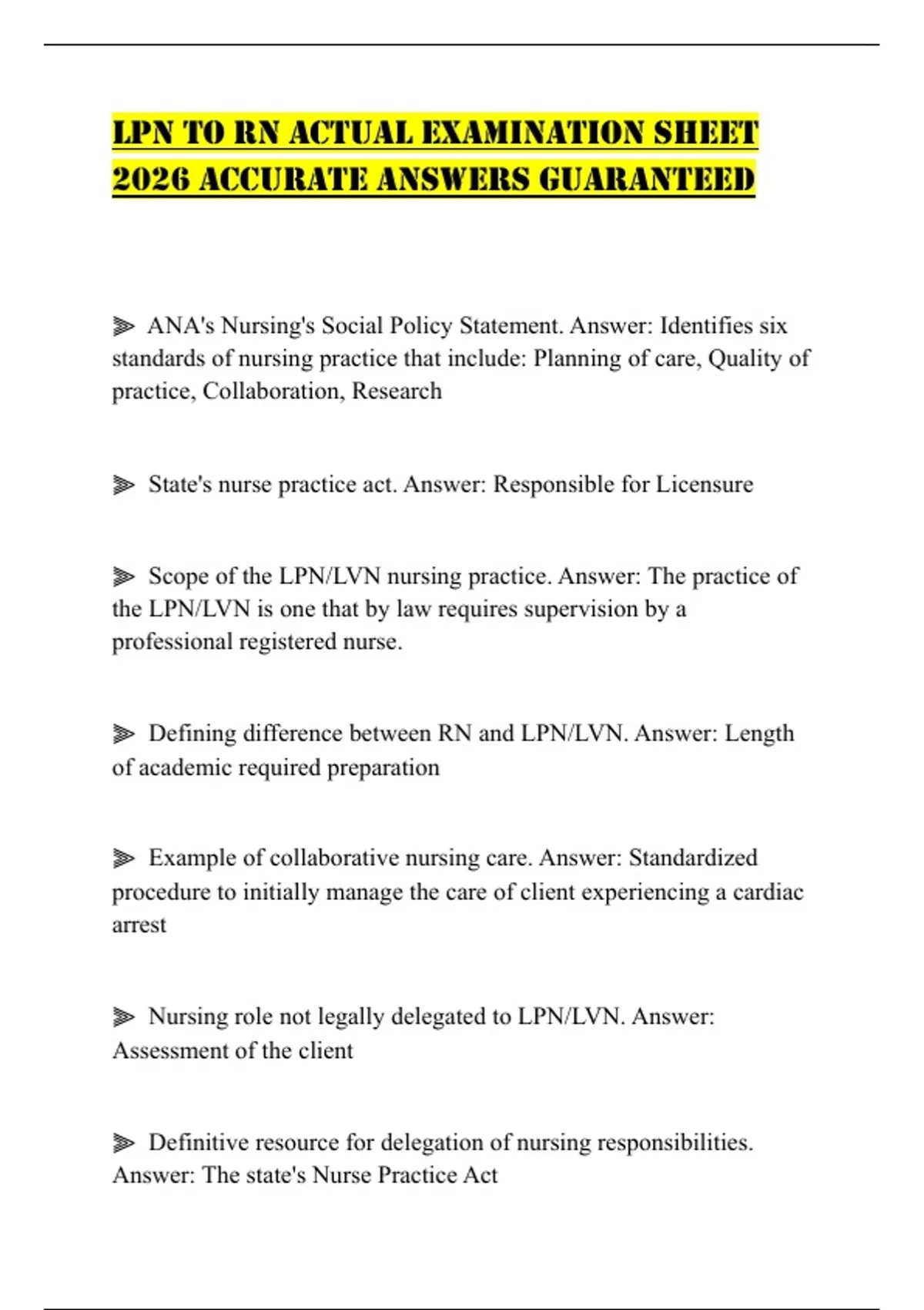 LPN TO RN ACTUAL EXAMINATION SHEET 2026 ACCURATE ANSWERS GUARANTEED
