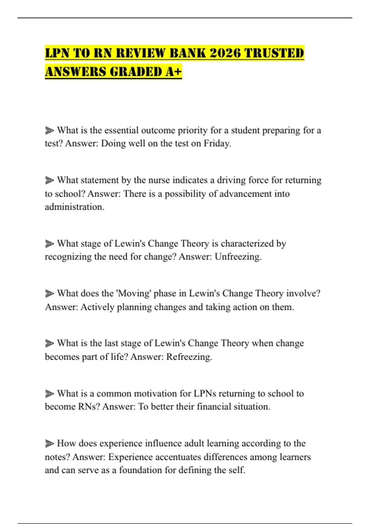 LPN TO RN REVIEW BANK 2026 TRUSTED ANSWERS GRADED A+
