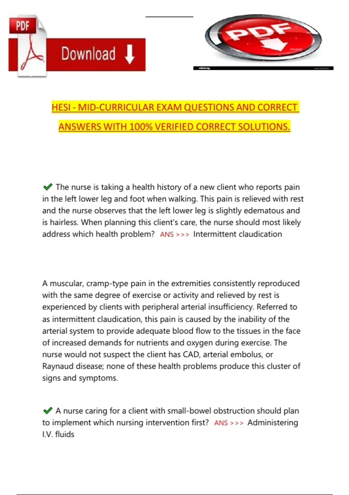 This document contains HESI mid-curricular exam questions with fully verified correct answers, covering core nursing concepts assessed midway through the nursing program. It is designed to support focused review and exam preparation, helping students strengthen clinical judgment and foundational knowledge.