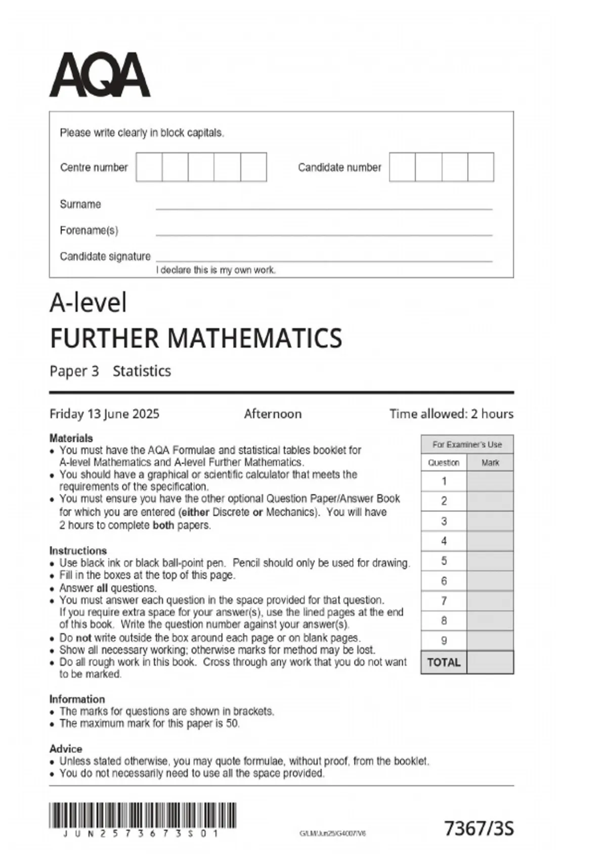 aqa a level further mathematics paper 3 statistics 2025 exam merged mark scheme