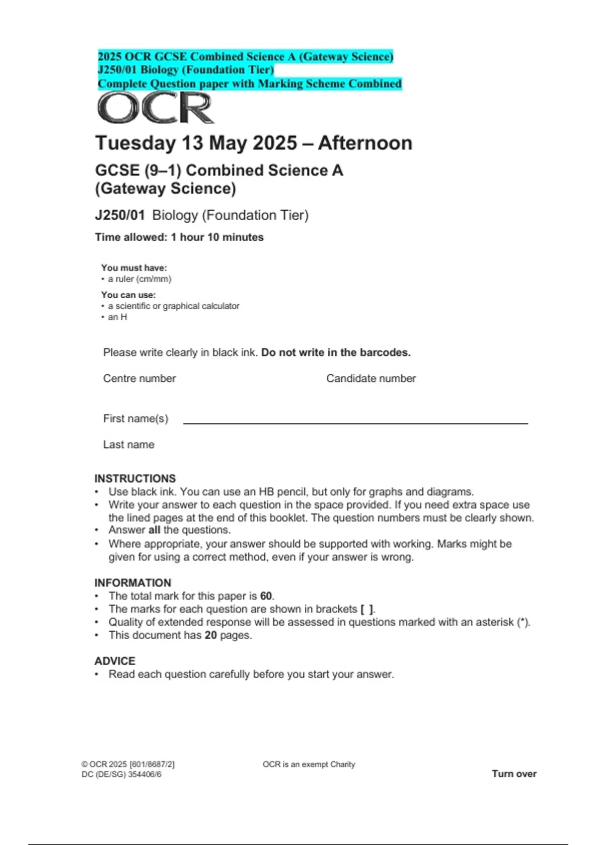 2025 OCR GCSE Combined Science A (Gateway) J250/01 – Biology Foundation Tier | Complete Question Paper & Marking Scheme PDF